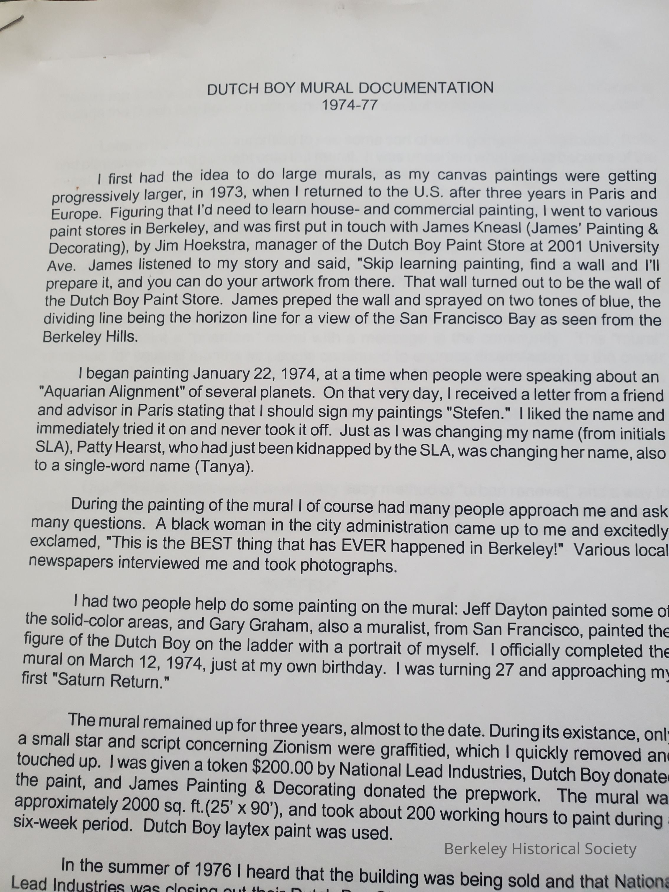 Contains "Dutch Boy mural documentation, 1974-1976" by Stefen, 1996 (2 l.); large format color photo of the mural by Mary Walsh, 1974; photocopies of several newspaper articles about the mural.