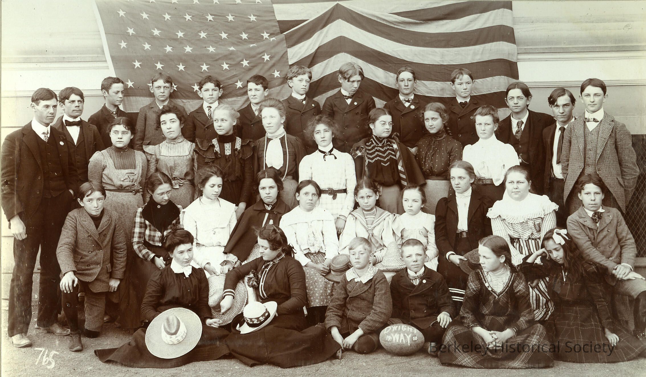 Class with the sign "Dwight Way 1900" painted on a ball in the first row, two women on the first row have their hats on the laps, a man standing on the left side (possibly the teacher), big American flag on the back wallMade/Created
