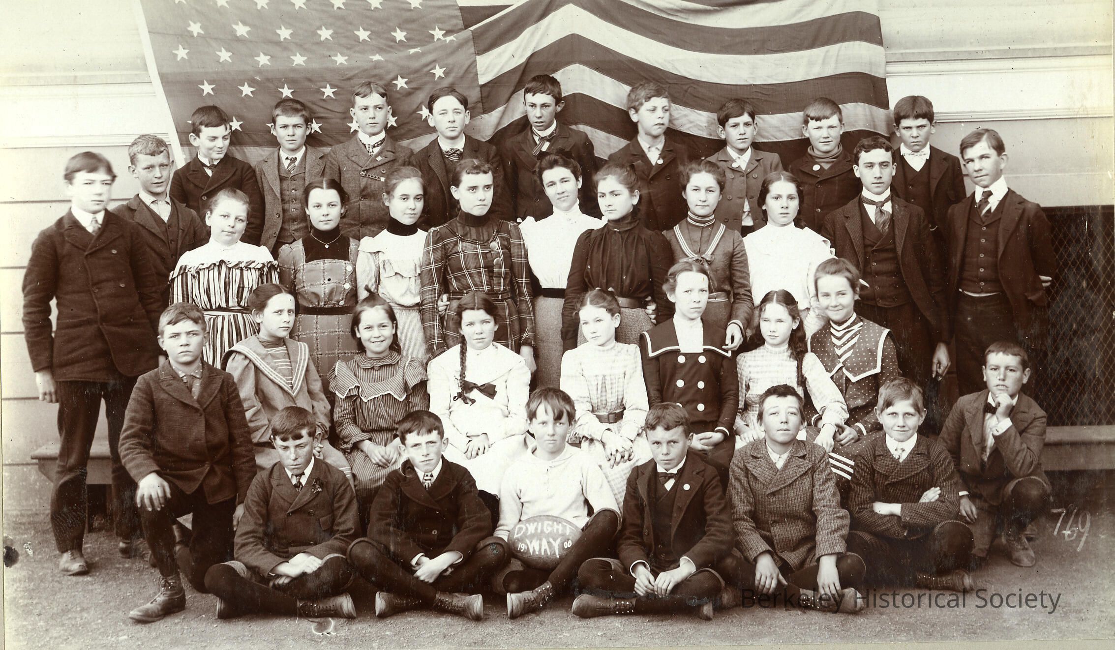 Class with the name "Dwight Way 1900" painted on a ball in the first row, a big American flag on the back wallMade/Created