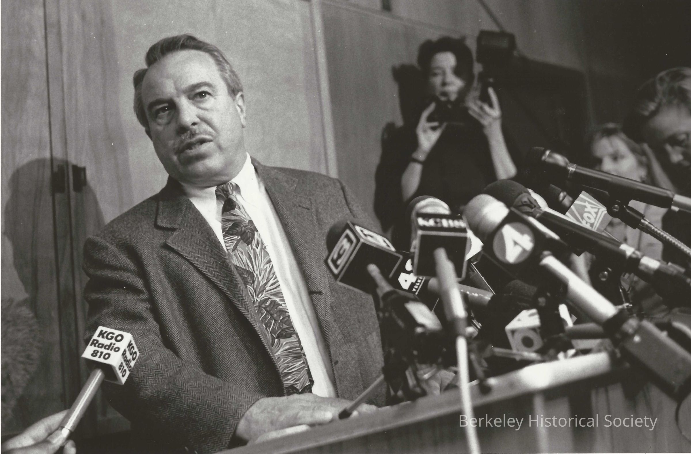 Addressing reporters at time of Unabomber crisis. University of California Mathematics Department