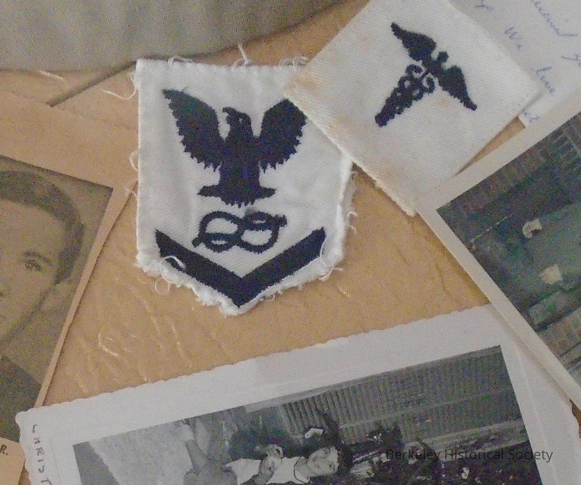 Black and white cloth insignia of an eagle and chevron. Worn by hospital corpsman Charles Richard Mullan, Jr. (Navy-HN-E3, 1st Battalion, 9th Marines..."Doc"). Born 12/16/46, died in Vietnam 6/28/67.