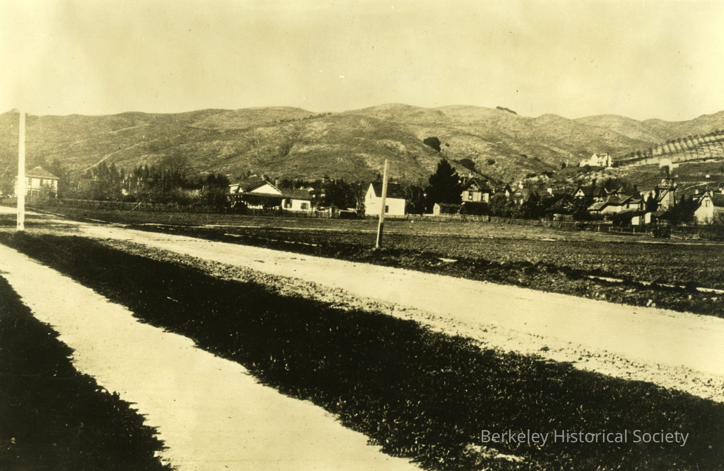 View to northeast; white road in foreground, some structures visible across empty fields; hills in background with an orchard on hill to extreme right of photo.