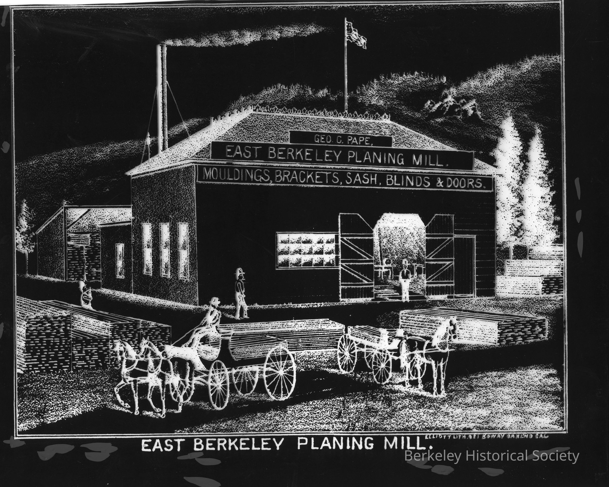 East Berkeley Planing Mill, Geo C Pape proprietor, Milvia NE Corner, at Addison. Transparency of lithographMade/Created