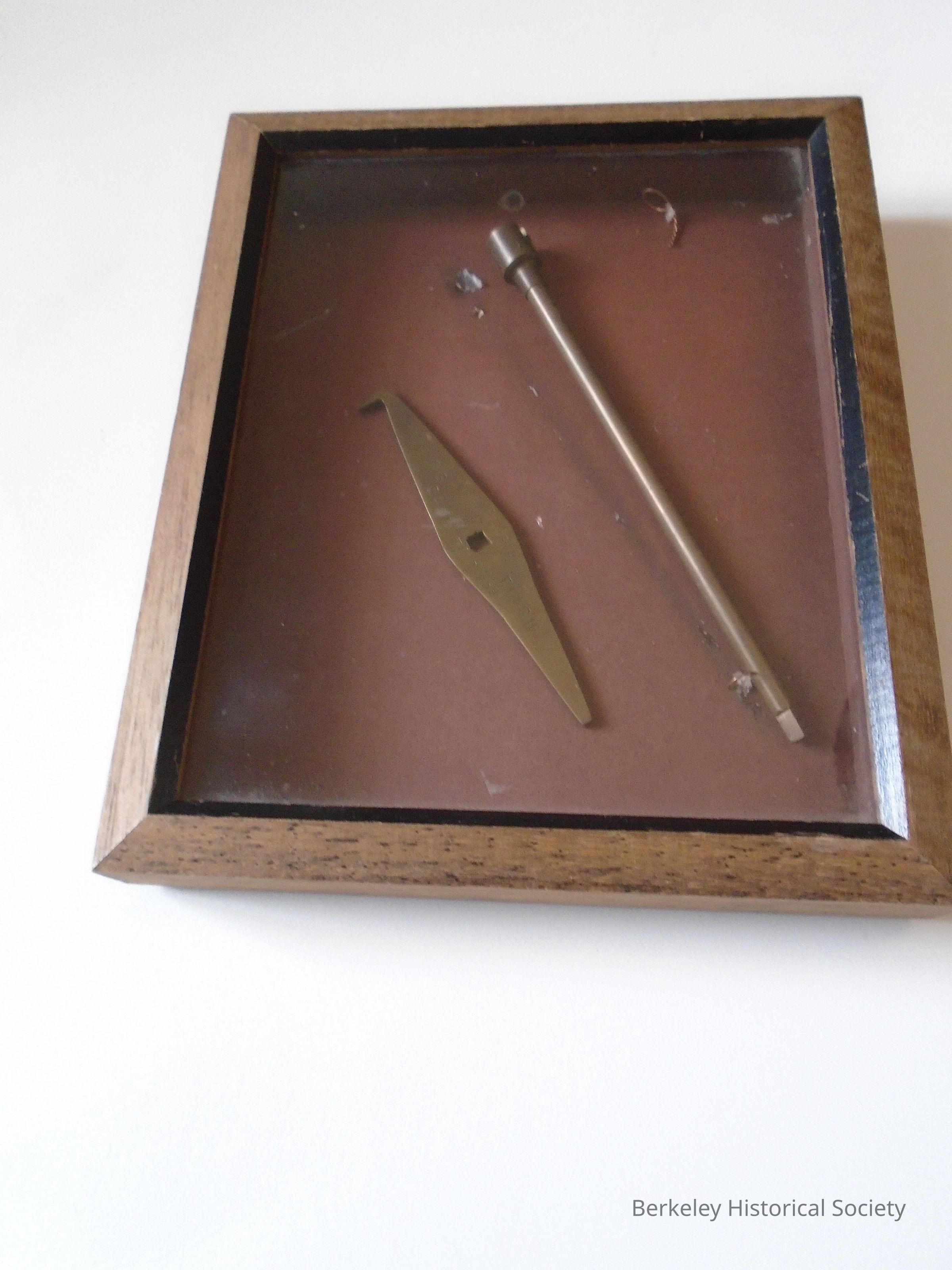 Bronze, East Bay Municipal Utility District wrench given to James Pinch in 1929 for his service. It is in a glass and wood framed shadow box (for display). Wrench is in 2 pieces. The handle is somewhat oblong 6" x 1", flat and has text: EBMUD JAMES FINCH 1907 TO 1939. The second piece is a solid cylinder about 8" long that would fit into the valve hole at one end and the handle at the other end. Box is 11" x 9" x 1".Made/Created