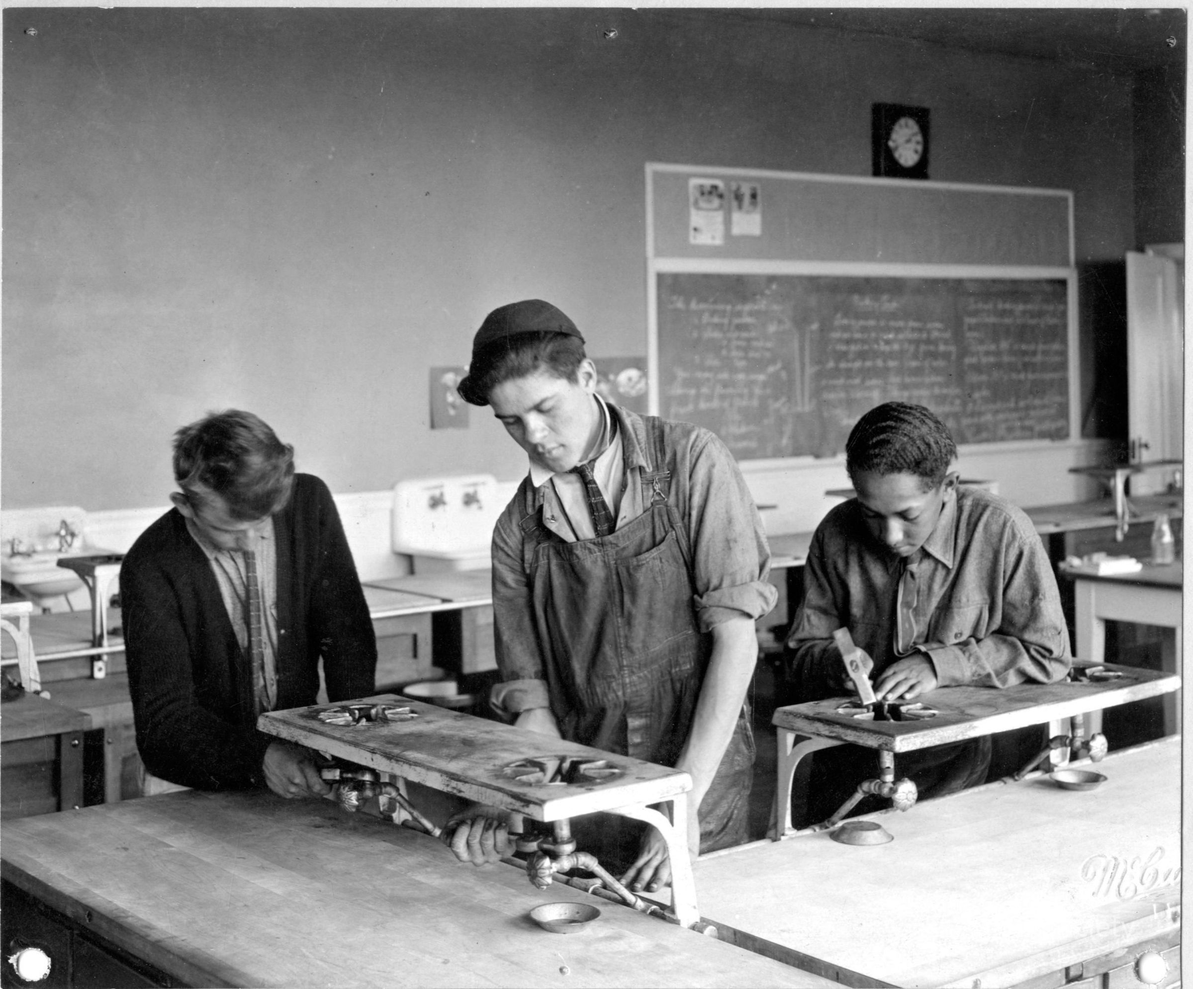 Three students on wood working project.