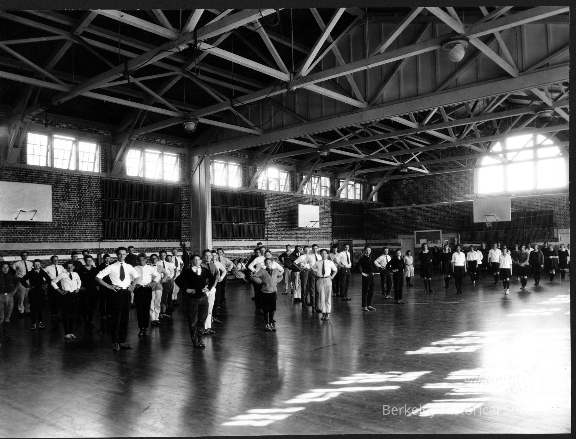 Students in gymnasium, standing in rows, boys with hands on hips.
