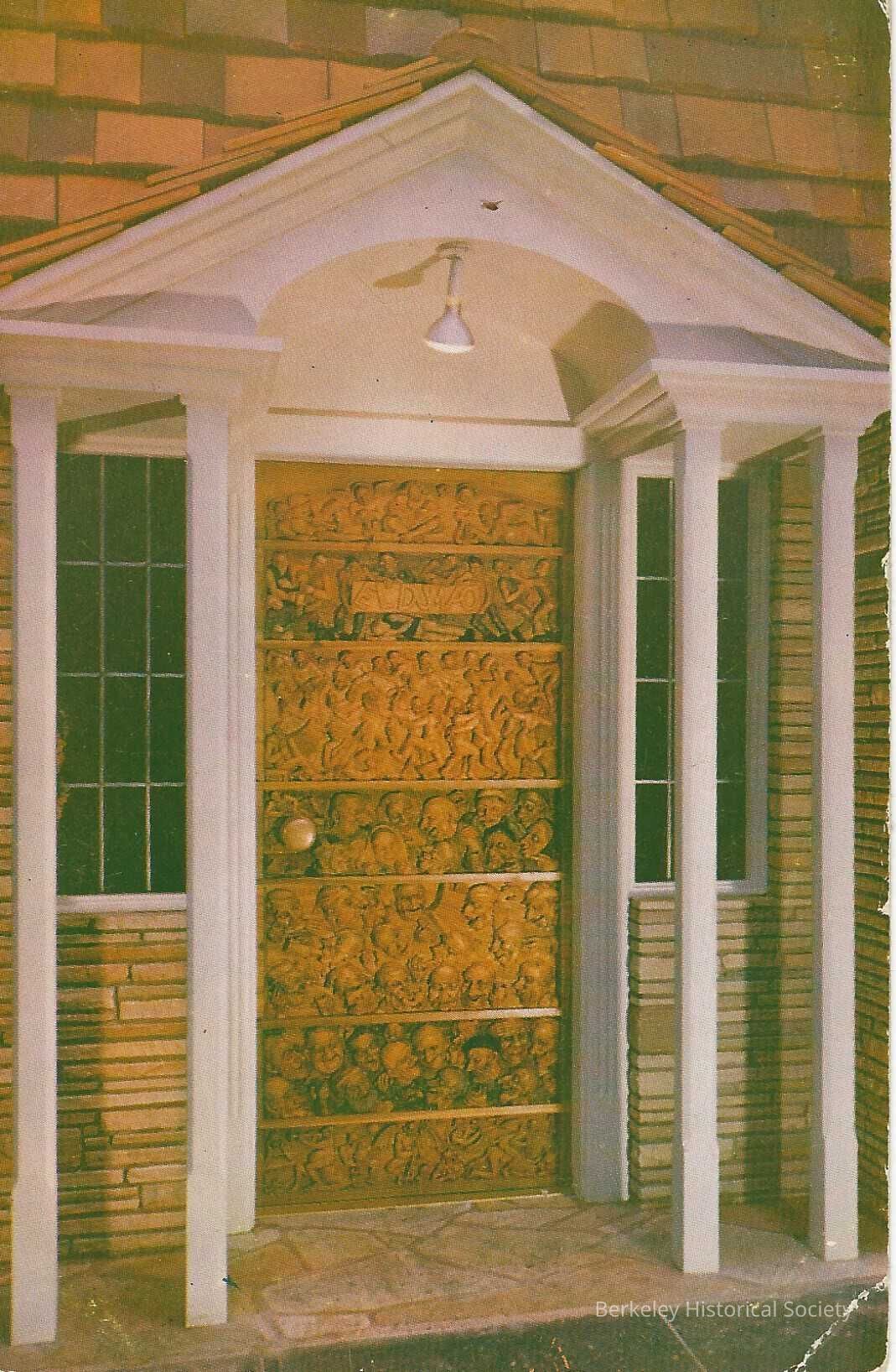 Front door of restaurant hand-carved by Emil Janel, per description on back of card. 2081 Allston Way.