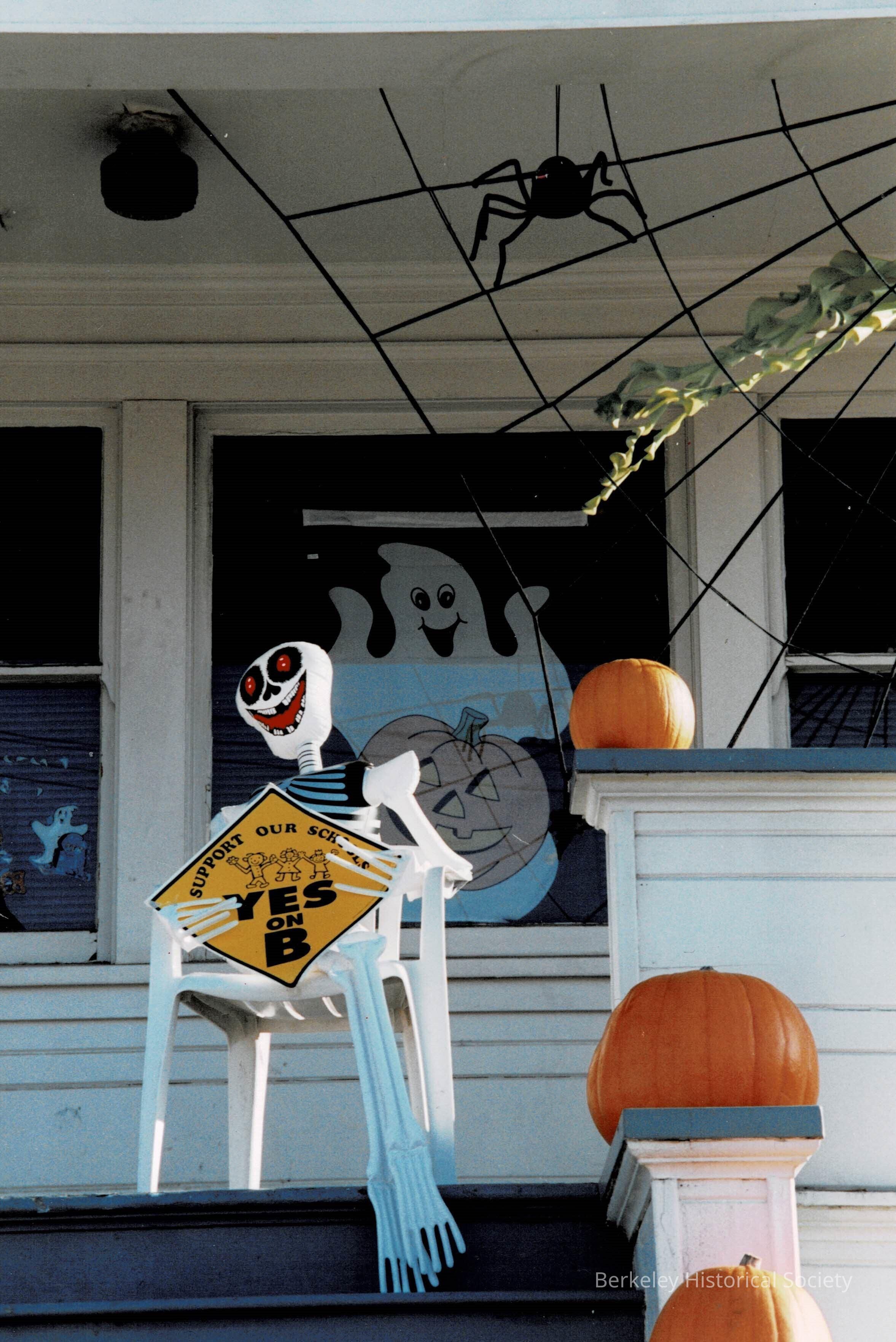 Snapshot taken of residential porch at Halloween, with skeleton holding sign: Yes on B, support our schools.Made/Created