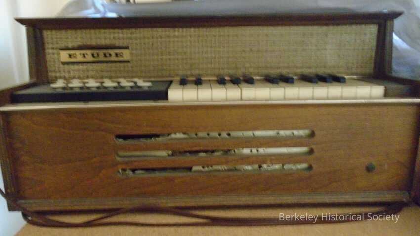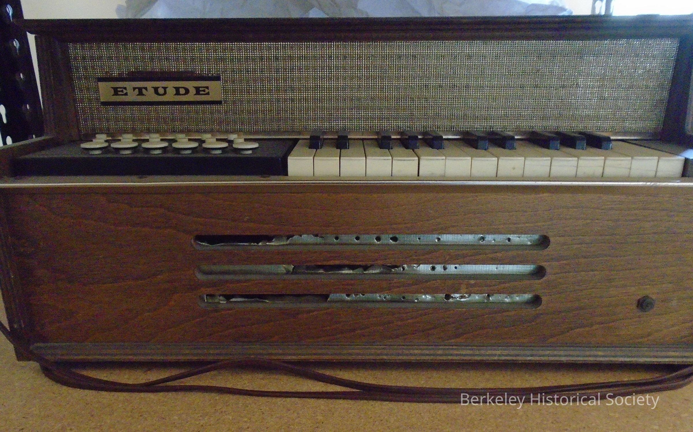 Etude electric organ encased in brown laminated wood. 15 white keys and 10 black, with 18 buttons on left in 3 rows for chord selection: row each for major, minor and bass chords. Buttons for major & minor don't seem to work. Cut out for sound in front (foil covering is torn) and a brass handle on each side. Missing a piece on top, probably for holding sheet music. Stamp on back shows made in New York. Organ was used in Jefferson School.Made/Created