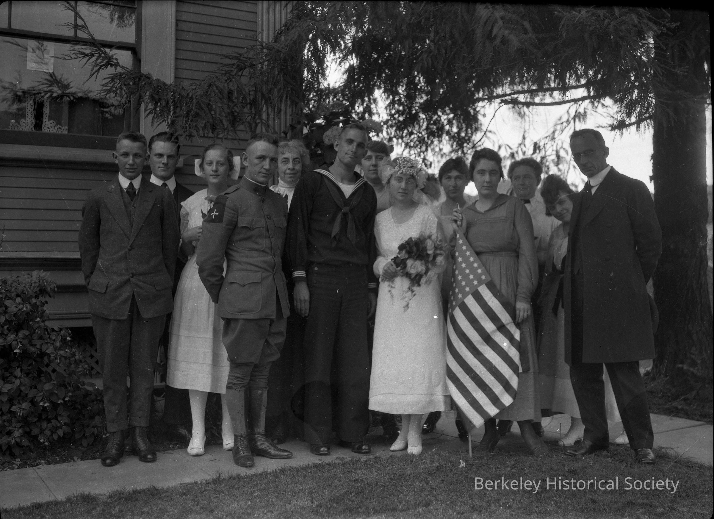 Unknown Ellis Family wedding photo including men in military uniform and bride.