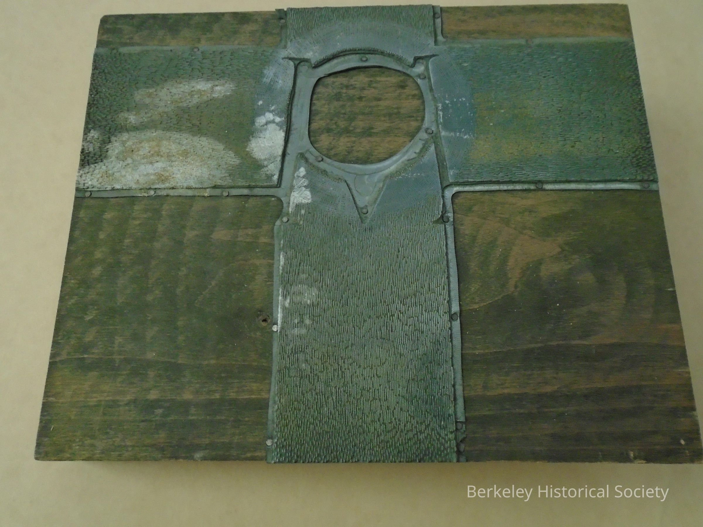 Printer's block for Planters Dock. Wood block with metal plate nailed to one side. Block is a cross shape with what looks like an M covered with an O in the center, where the two cross pieces join. The cross shape has a wood texture pattern, and the MO has a faint ring around it. The metal in the center of the O is cut out, as is the metal surrounding the cross shape. Handwritten in pencil on the back: "Planters Dock".Lexicon