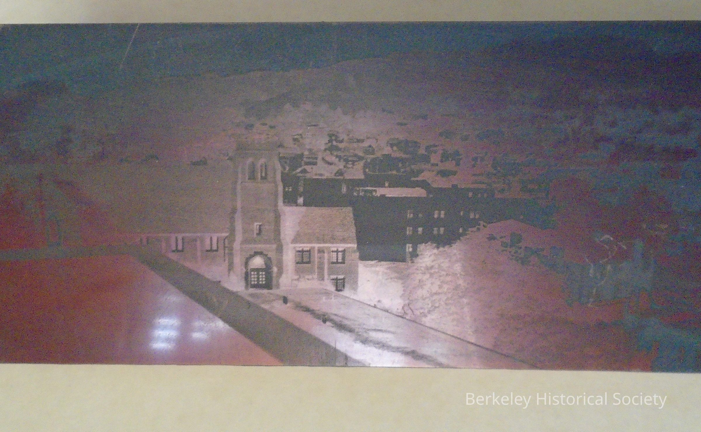 Panorama printer's block with image of Berkeley facing towards hills. Wooden block with engraved copper plate attached, some scraps of paper on other side: one on bottom left without image, one on right with partial copy of the image. Possibly from Berkeley Gazette.Lexicon