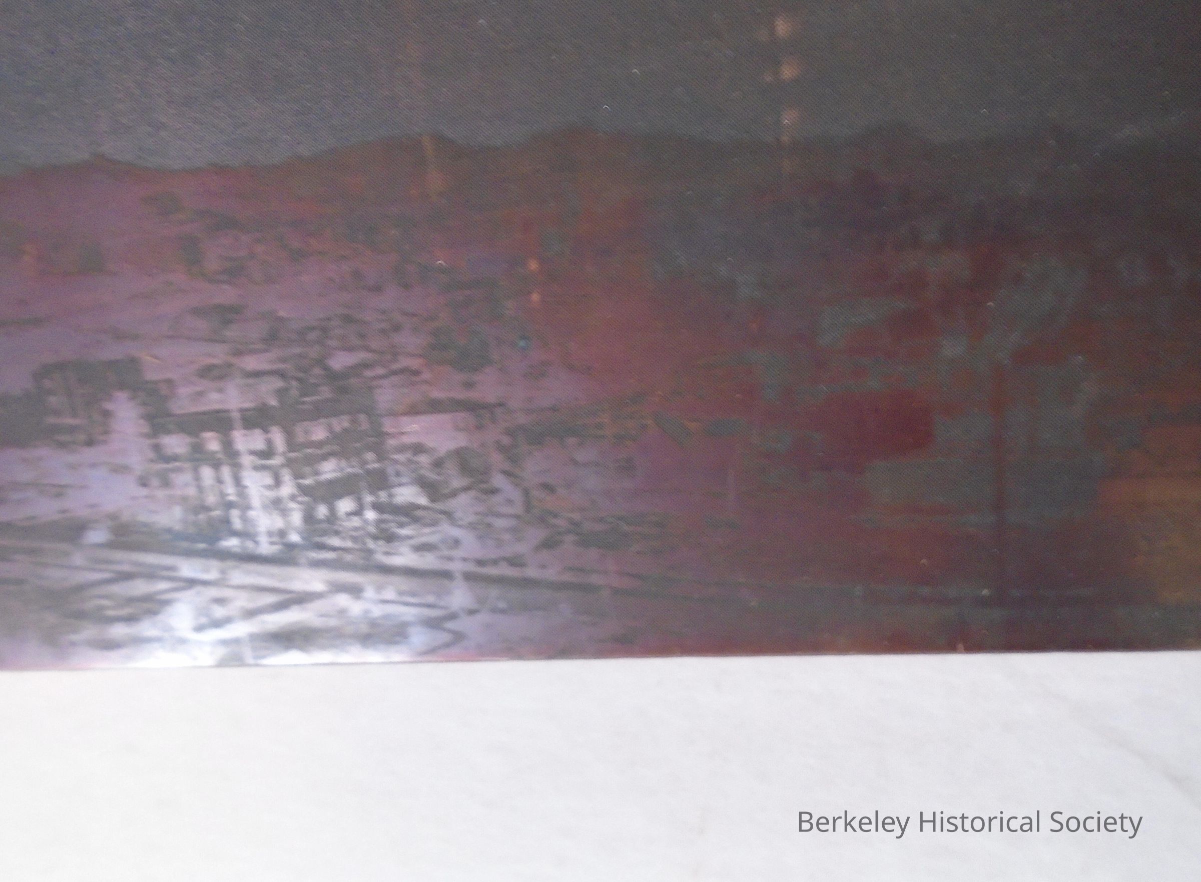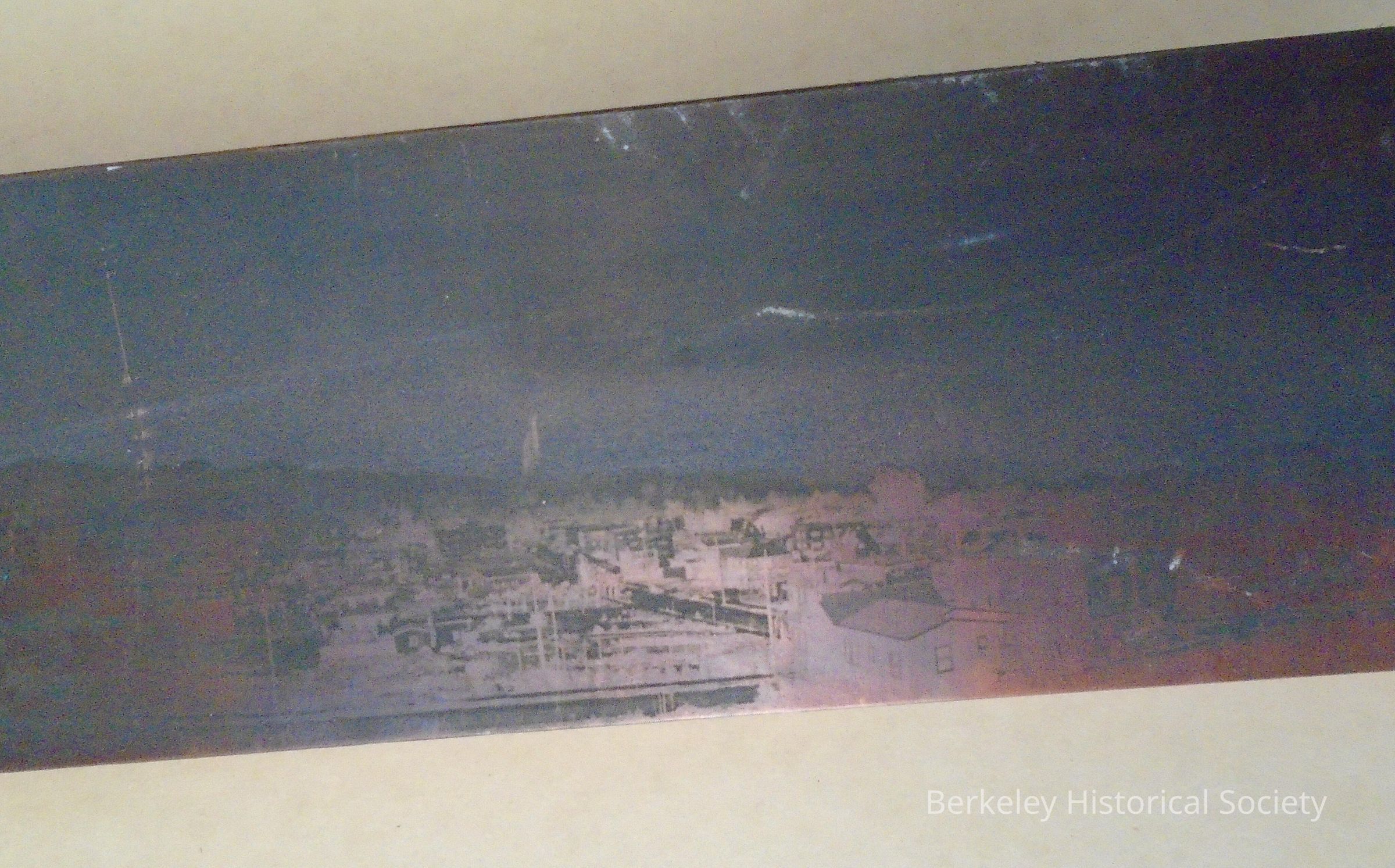Panorama printer's block with early image of Berkeley. Shows a major street with some multi-story buildings. Wooden block with engraved copper plate attached. Some white paper with image glued to bottom on back side. Paper is coming off wood. Possibly from Berkeley Gazette.Lexicon