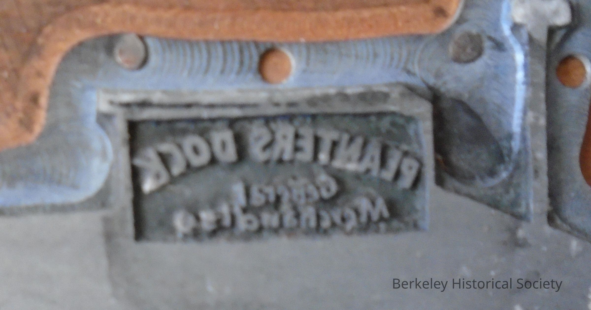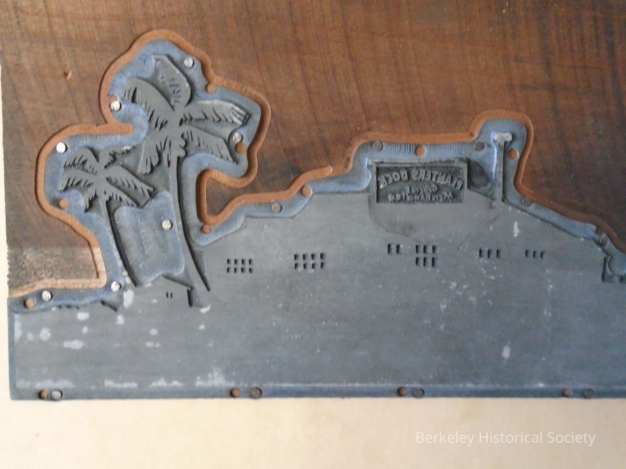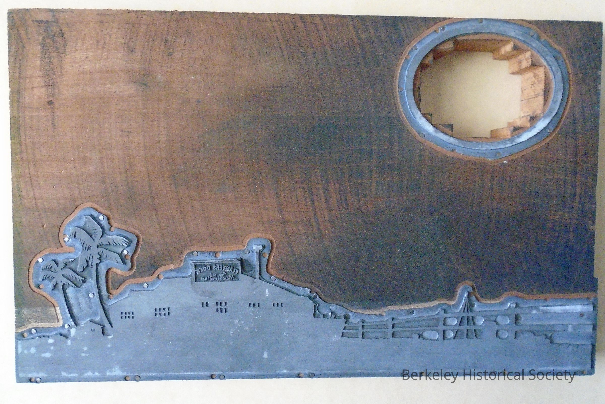 Printer's block for Planters Dock. Wood block with pieces of metal plates nailed to one side. Along the bottom is a picture of two palm trees, a dock and a building with a sign saying: "Planters Dock, General Merchandise". On the top right is an oval ring. The wood inside the ring has been cut away in a stepped shape.Lexicon