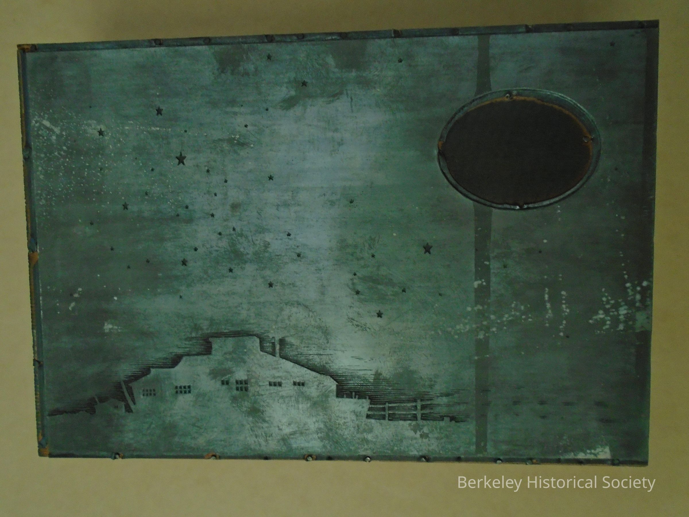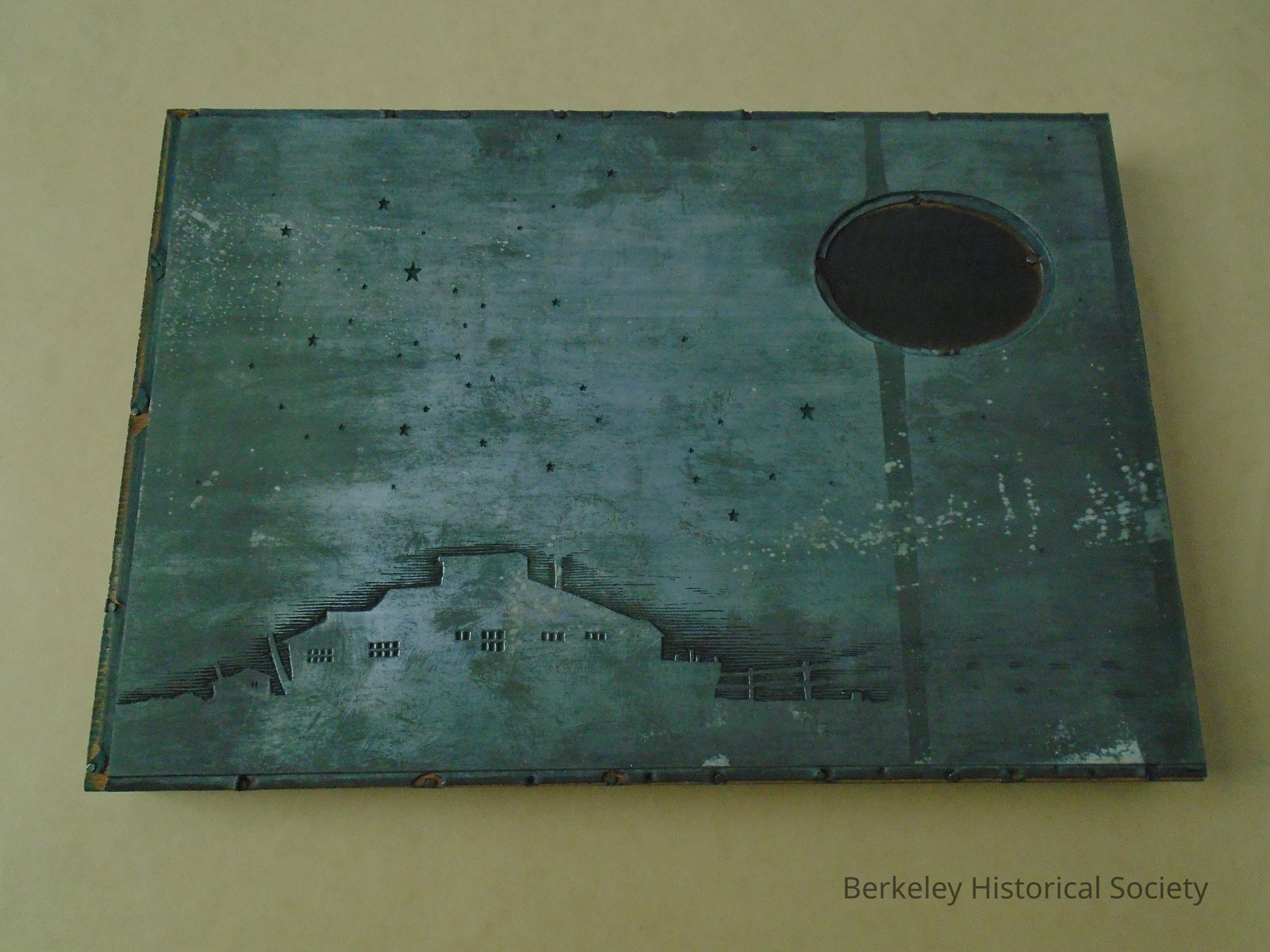 Printer's block, possibly for Planter's Dock. Wood block with metal plate nailed to one side. Along the bottom is a picture of a building. It resembles the Planters Dock building in number 1978.002.068. On the top right is an oval ring, as in 1978.002.068. However, this block appears to be a night scene. The plate covers the whole area of the wood, with the exception of the area inside the oval. Small star shapes are scattered around the plate. On the back side is a piece of glossy white paper with fingerprints in blue ink.Lexicon
