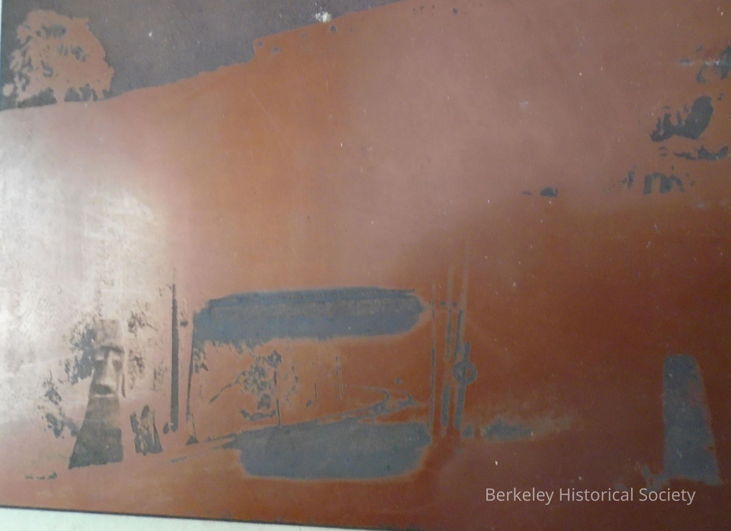 Copper printer's plate engraved with what appears to be a gate with Easter Island-type statues. Very similar to 1978.002.074 and 1978.002.076. Image is blurred or scratched above and below the gate. Difficult to photograph. Back has the letter "y" in pencil, and logo of "Zomo-Backo Photo-Engravers Metal".Lexicon