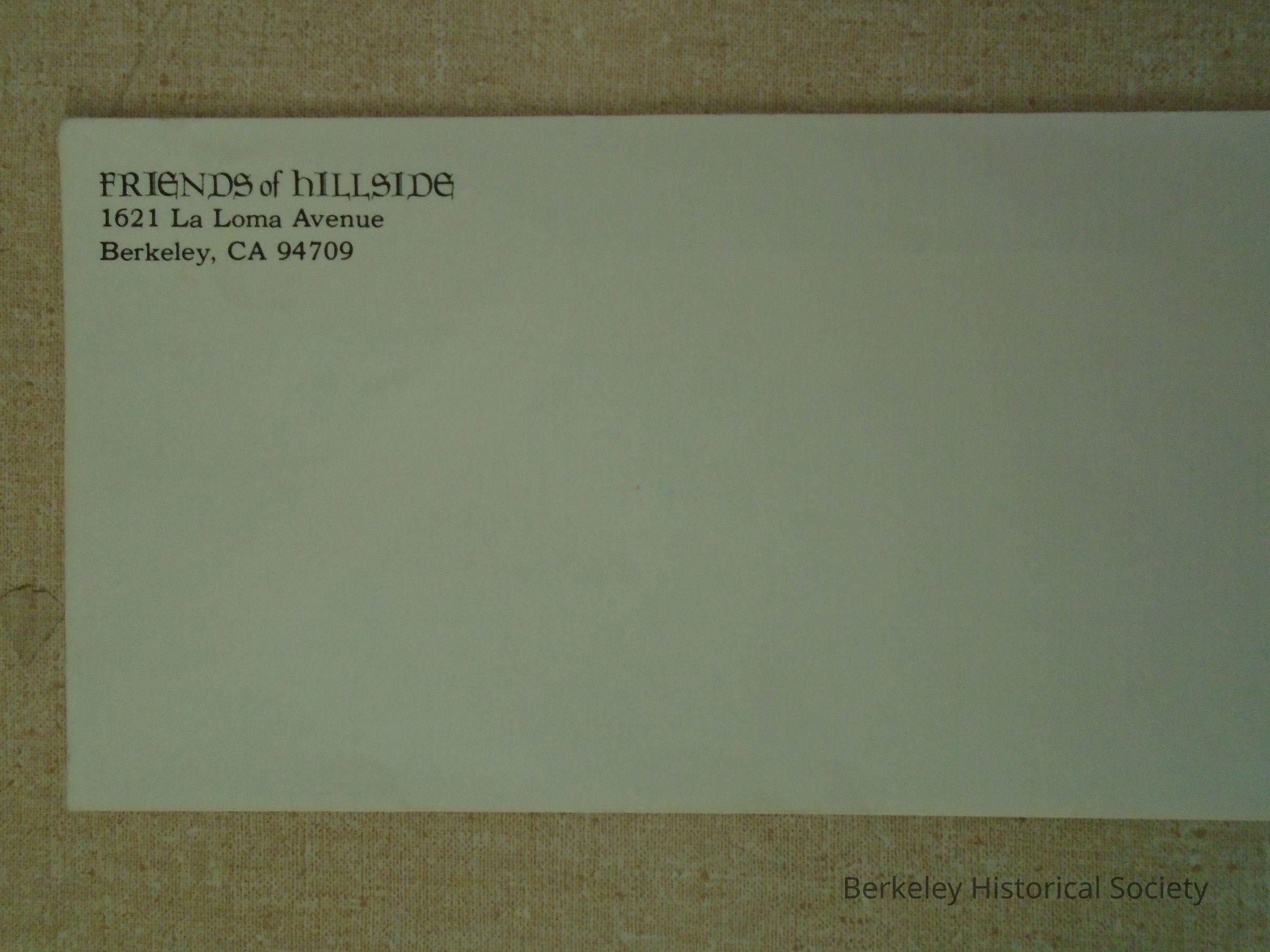 Business envelope with printed return address for Friends of Hillside, 1621 La Loma Avenue, Berkeley, CA 94709.