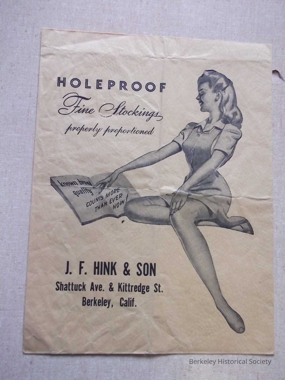 Brown paper envelope for pair of women's stockings. Printed on it: "J.F. Hink & Son, Shattuck Ave. & Kittredge St., Berkeley, Calif." and "Holeproof Fine Stockings properly proportioned" with a picture of a woman.