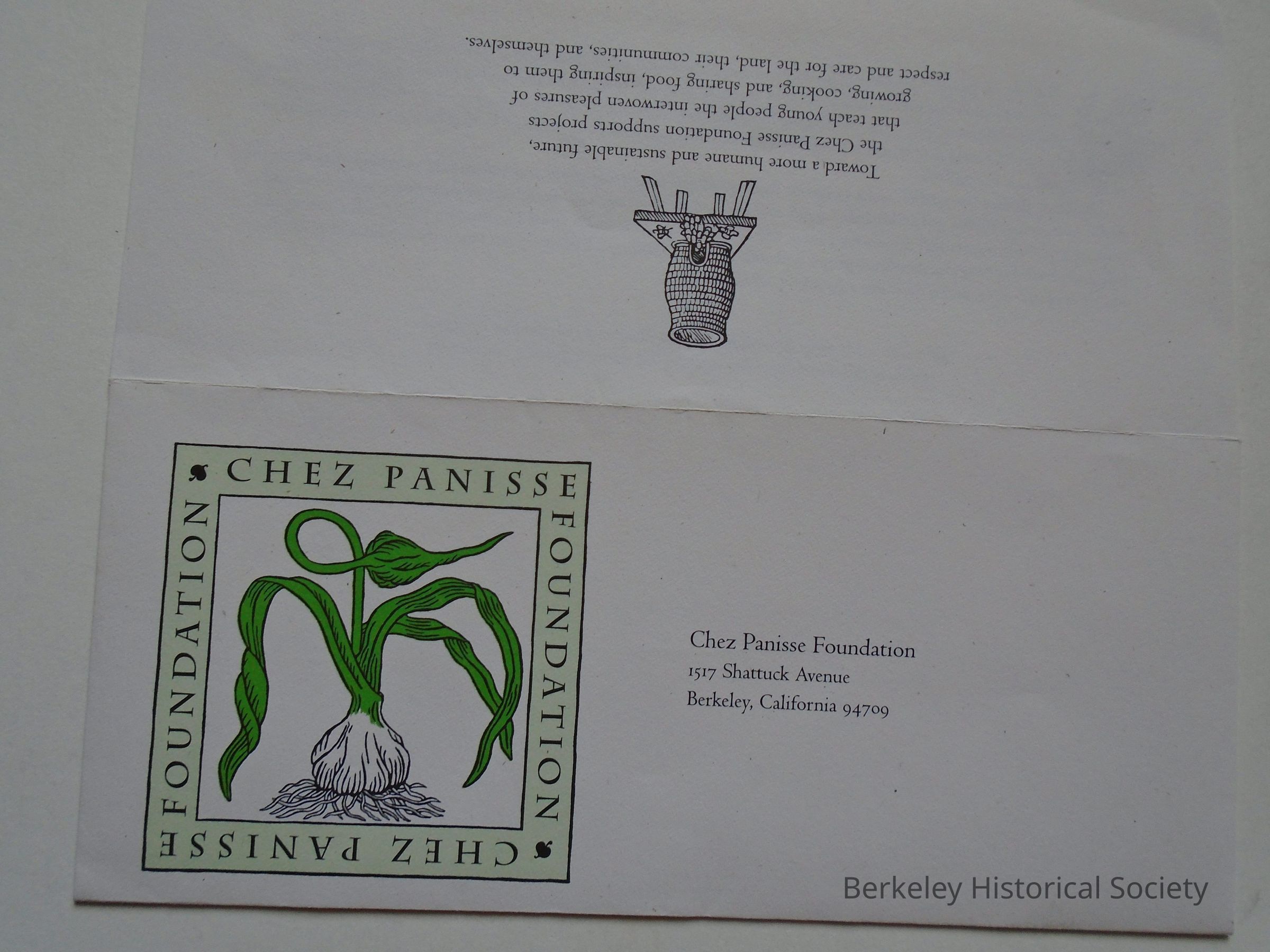 Chez Panisse Foundation paper envelope. Shows a bulb of garlic and address: 1517 Shattuck Avenue, Berkeley, California 94709. Inside: gives benefits of giving and mission statement.Made/Created