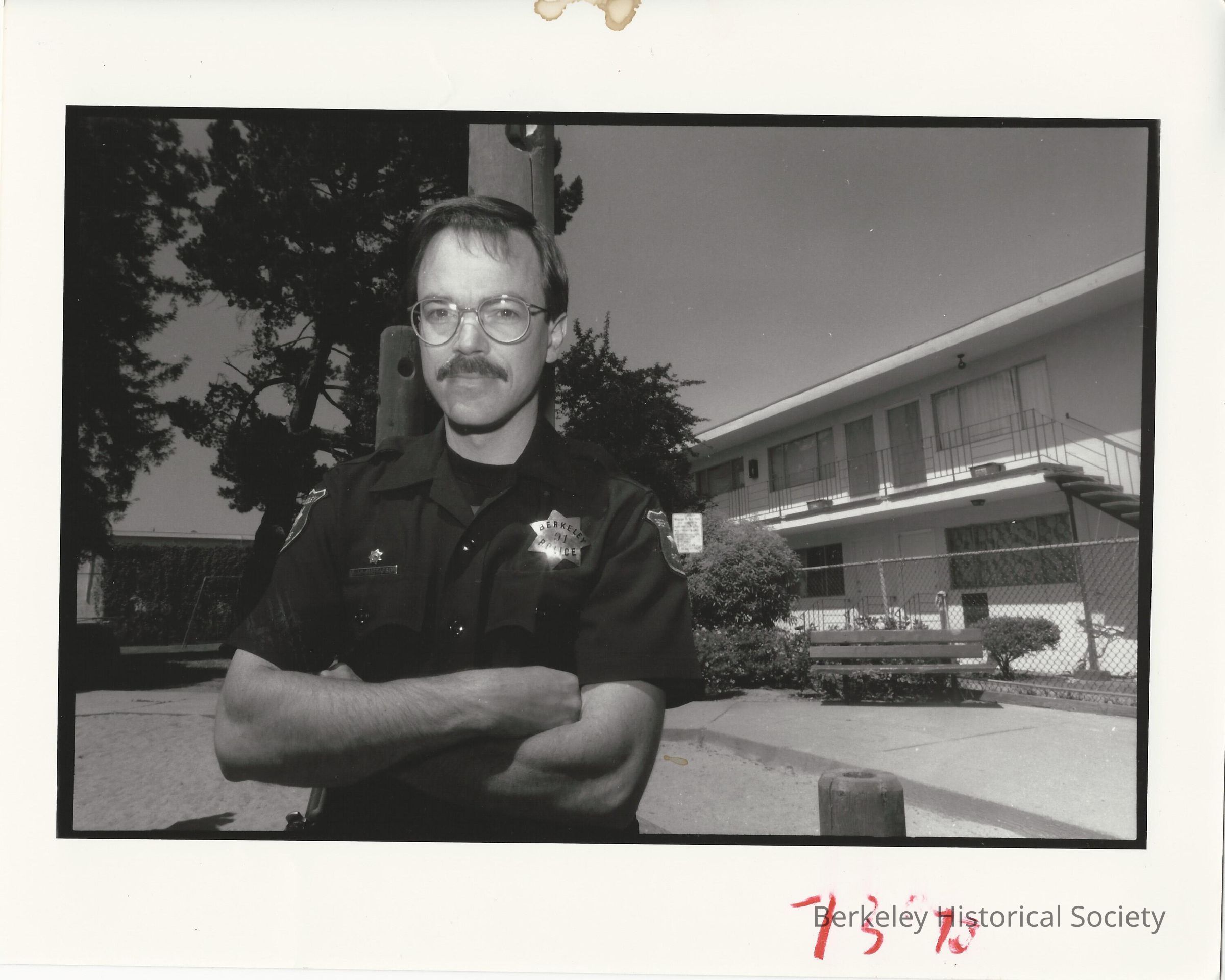 Policeman. in front of apartment building now rid of drug problem.