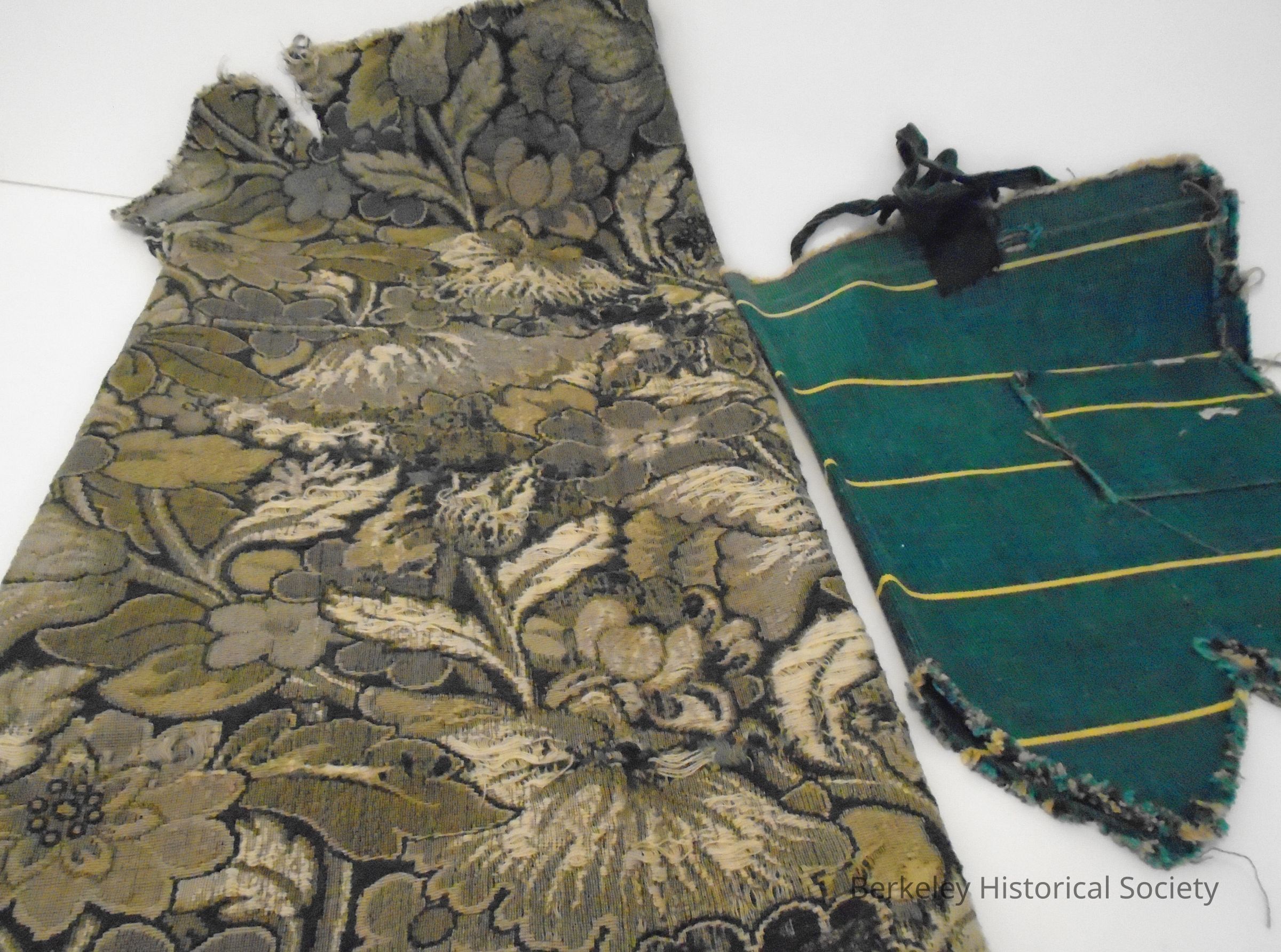 3 pieces of material. 2 pieces the same brown & beige floral design. Probably furniture fabric. The third piece may have been a shoe cover for traveling. Rectangular green and yellow stripe canvas with 2 loops (for carrying?)....meant to wrap around shoes and tie with brown cord. A small pocket sewn on it. 22" x 15". From the home of Alice Sylvester Brown & husband and sons.Made/Created