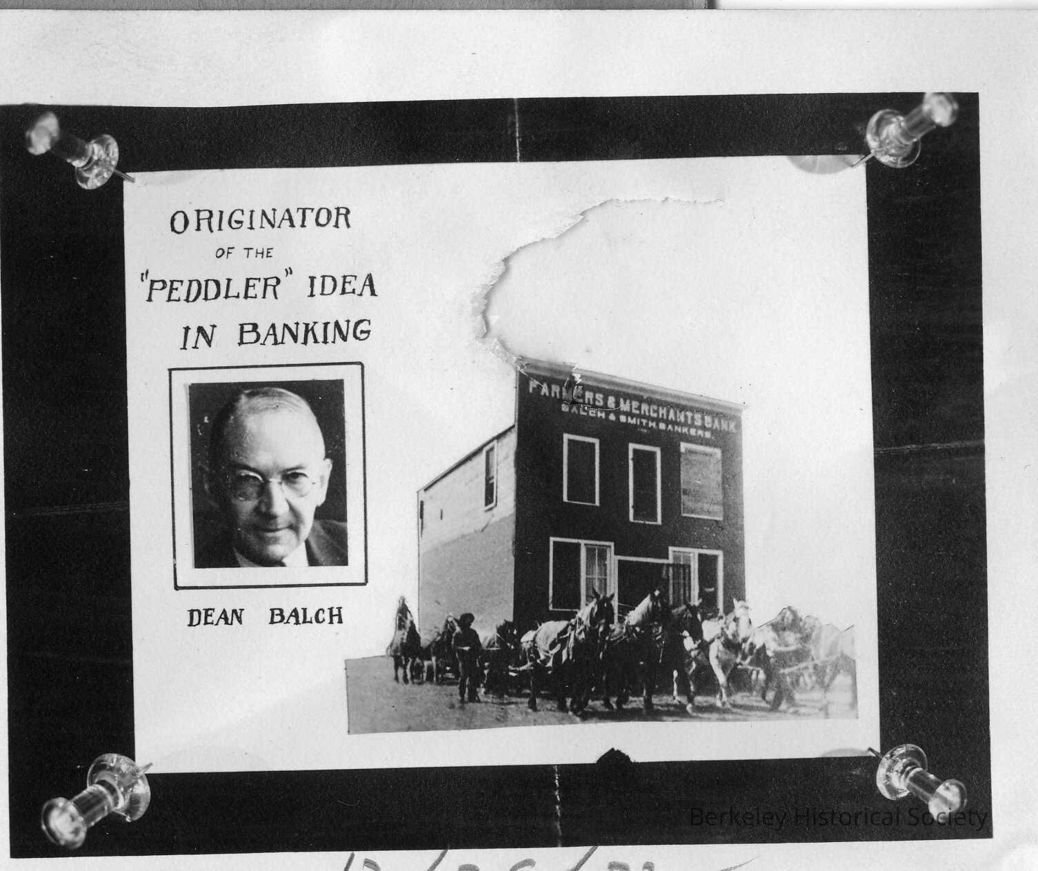 Farmer & Merchants Savings Bank building being moved by horse teams. 1103 Broadway, Oakland, with portrait photo of Dean Balch, "originator of the 'peddler' idea in banking."Made/Created