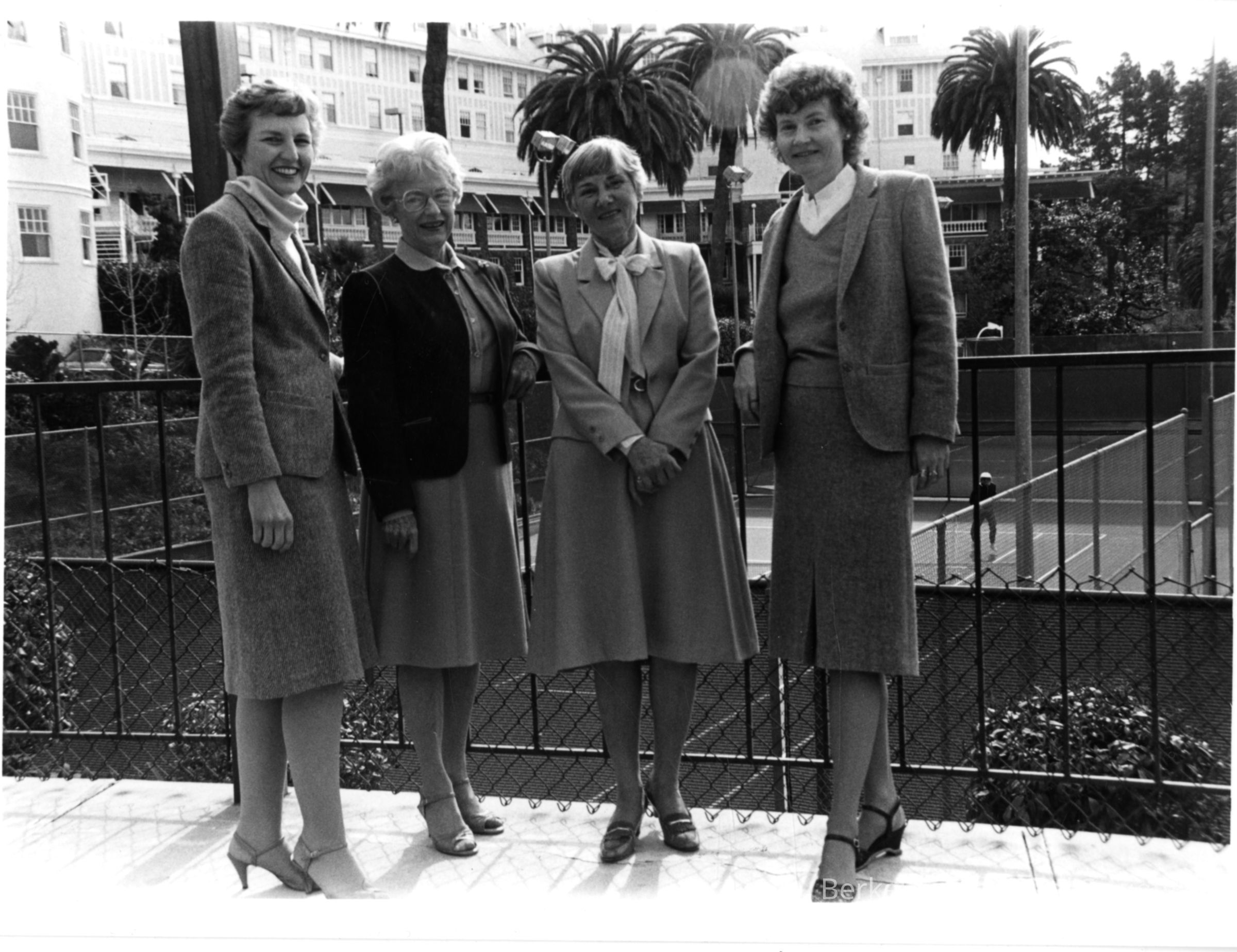 Four women in suits on a balcony with tennis courts and hotel in background. LaVonne NIccols, Gloria Callaghan, Tad Niccols, Dr. Noele Krenkel.Other Names and Numbers