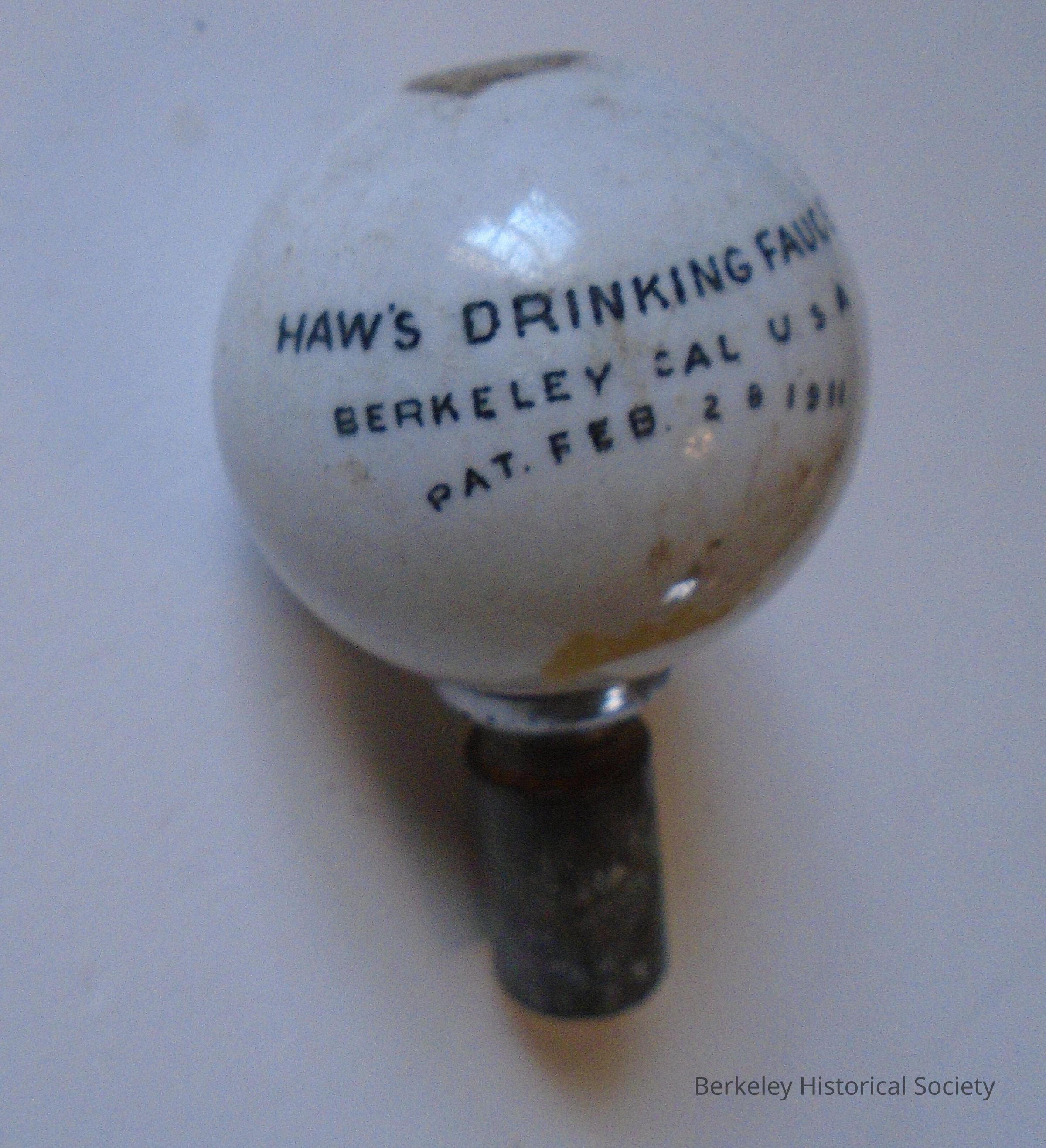 White, solid porcelain and metal drinking faucet knob. Printed on it: Haw's Drinking Faucet, Berkeley Cal USA. Pat. Feb 28, 1911.