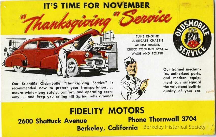 Postcard advertising Fidelity Motors at 2600 Shattuck Avenue. Main text of the advertisement reads A little bird told us it's time for November "Thanksgiving" Service.