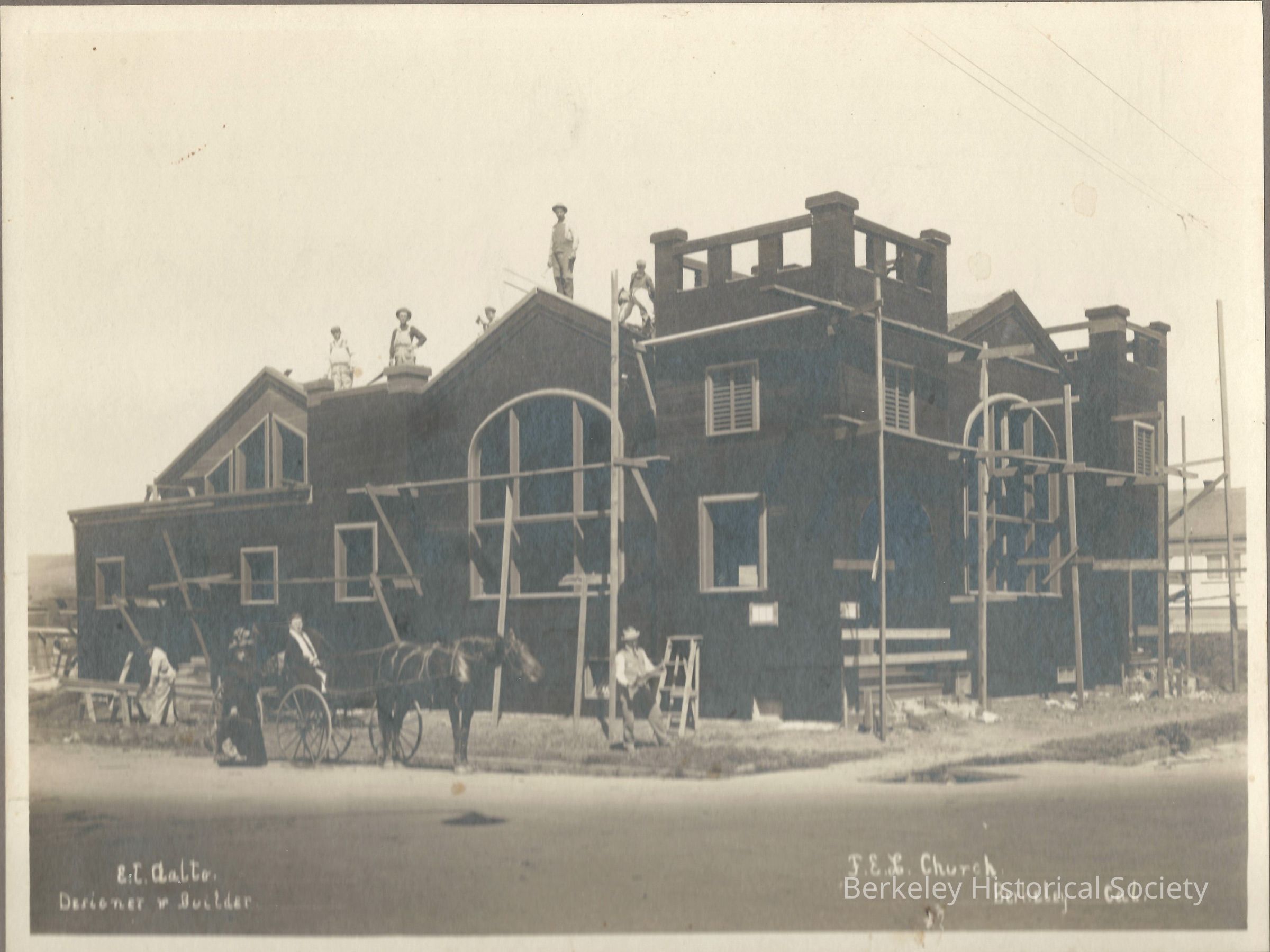 Photo of church under construction. E. J. Aalto, designer and builder. Cornerstone of church was laid in April 1912. Church located at 8th Street and Channing Way. Man standing at corner is Isa Laine. 1912 directory lists Aalto as a carpenter. Photo possibly by Johannes Moller, whose name is stamped on the verso, although seemingly of a later date. Part of site currently occupied by Grace Baptist Church.Lexicon