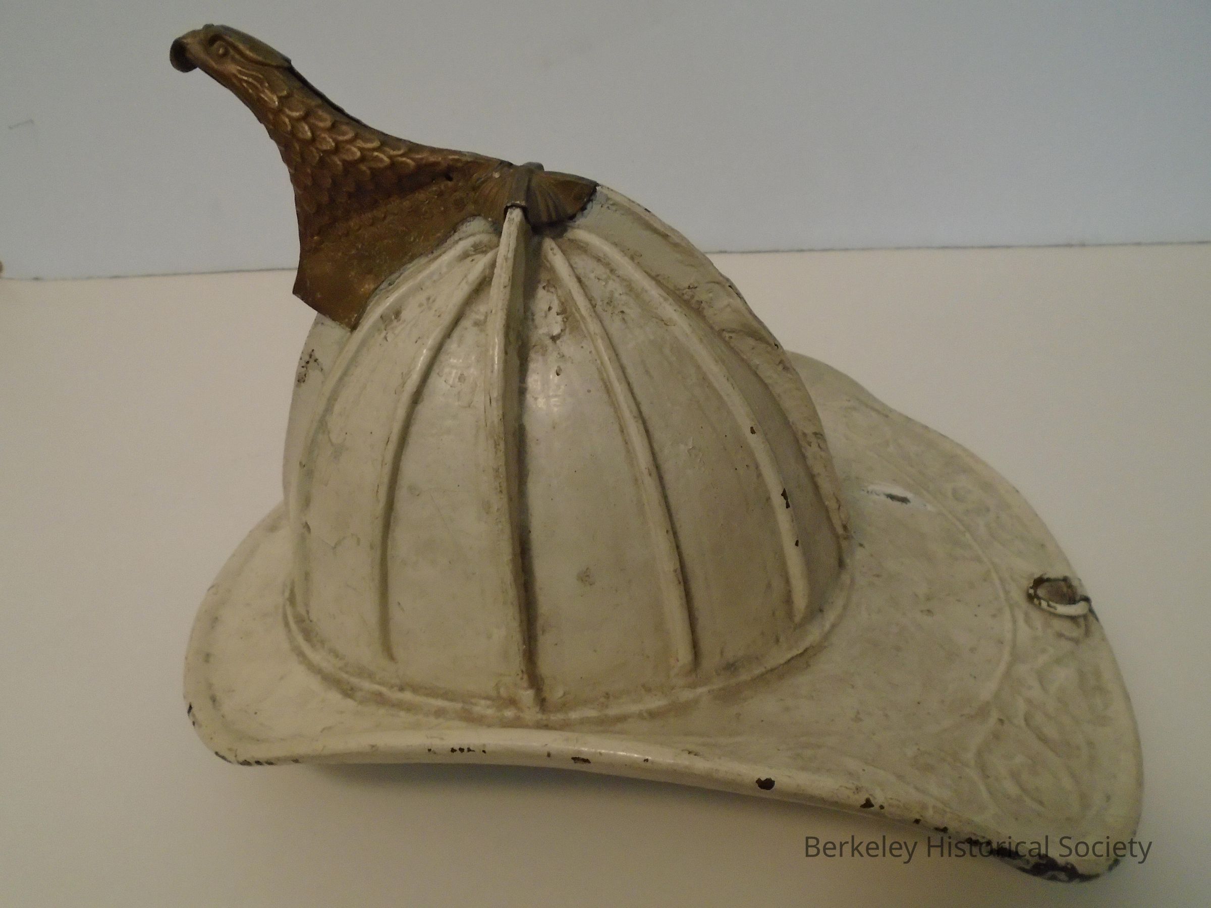 Fire helmet of Chief G. Sydney Rose, chief of Berkeley Fire Dept 1917-1927. Molded hard leather, white coating and metal eagle's head protruding from top front. Molded decorative design around brim and a metal loop for hanging. Felt lining. Chief Rose died in the line of duty.Lexicon