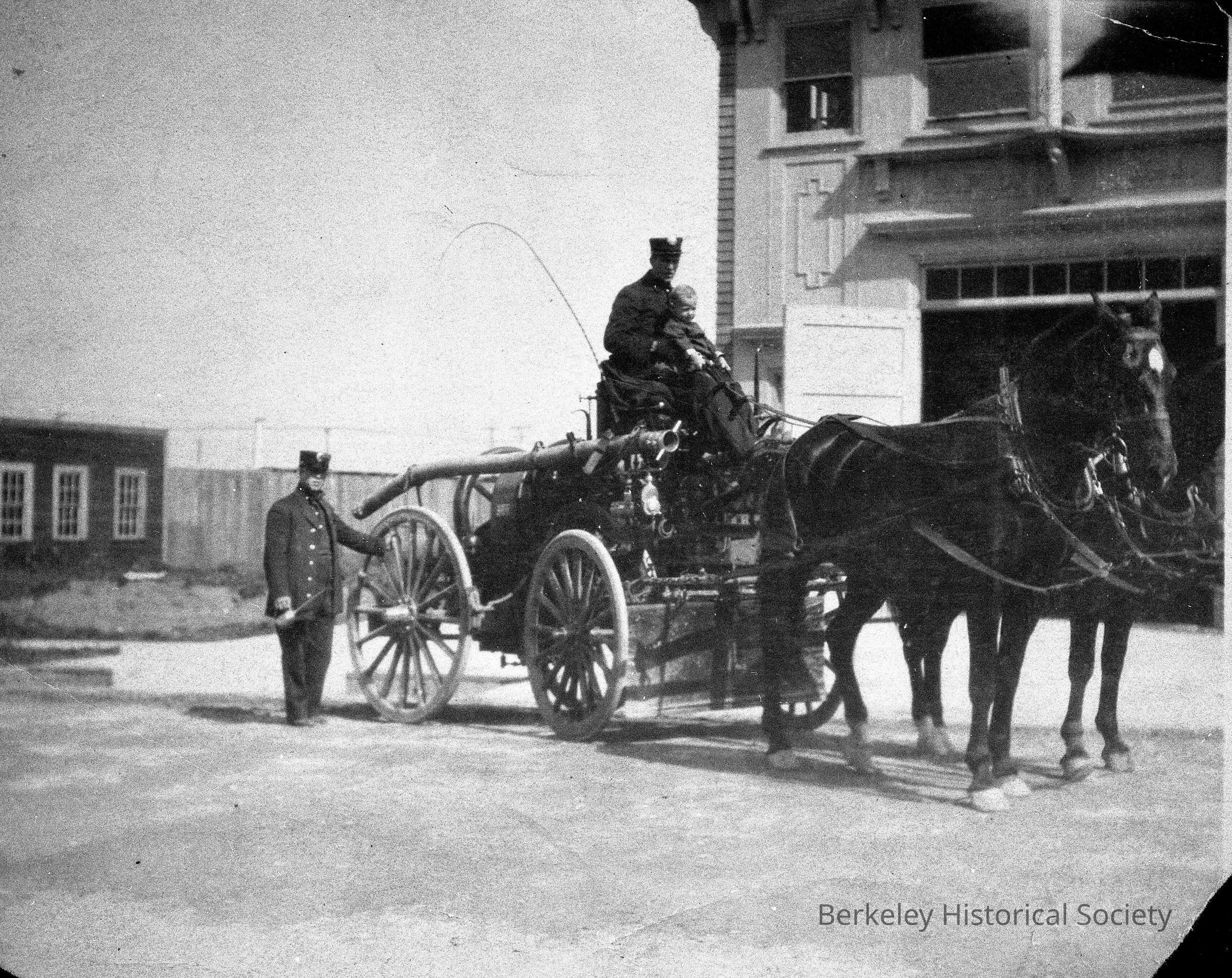 Fire Station #3, 1890.. Horse drawn vehicle; two men. 2021 Emerson Bob Abernathy, gas engine pump