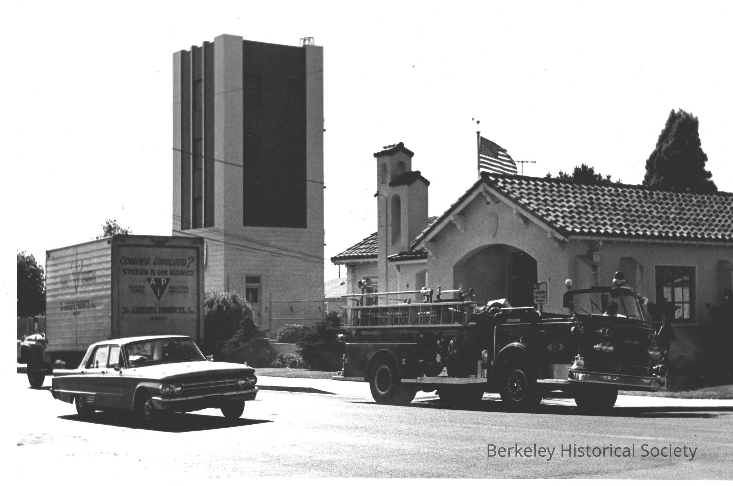 999 Cedar Street. Fire truck in front of station; vehicles in the street.