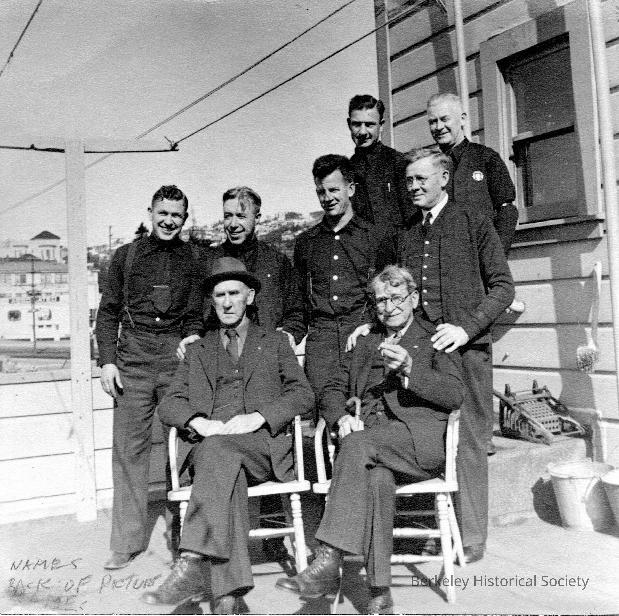Firemen posed outside North Berkeley Firehouse, Shattuck and Vine. Names on back of photo.Other Names and Numbers