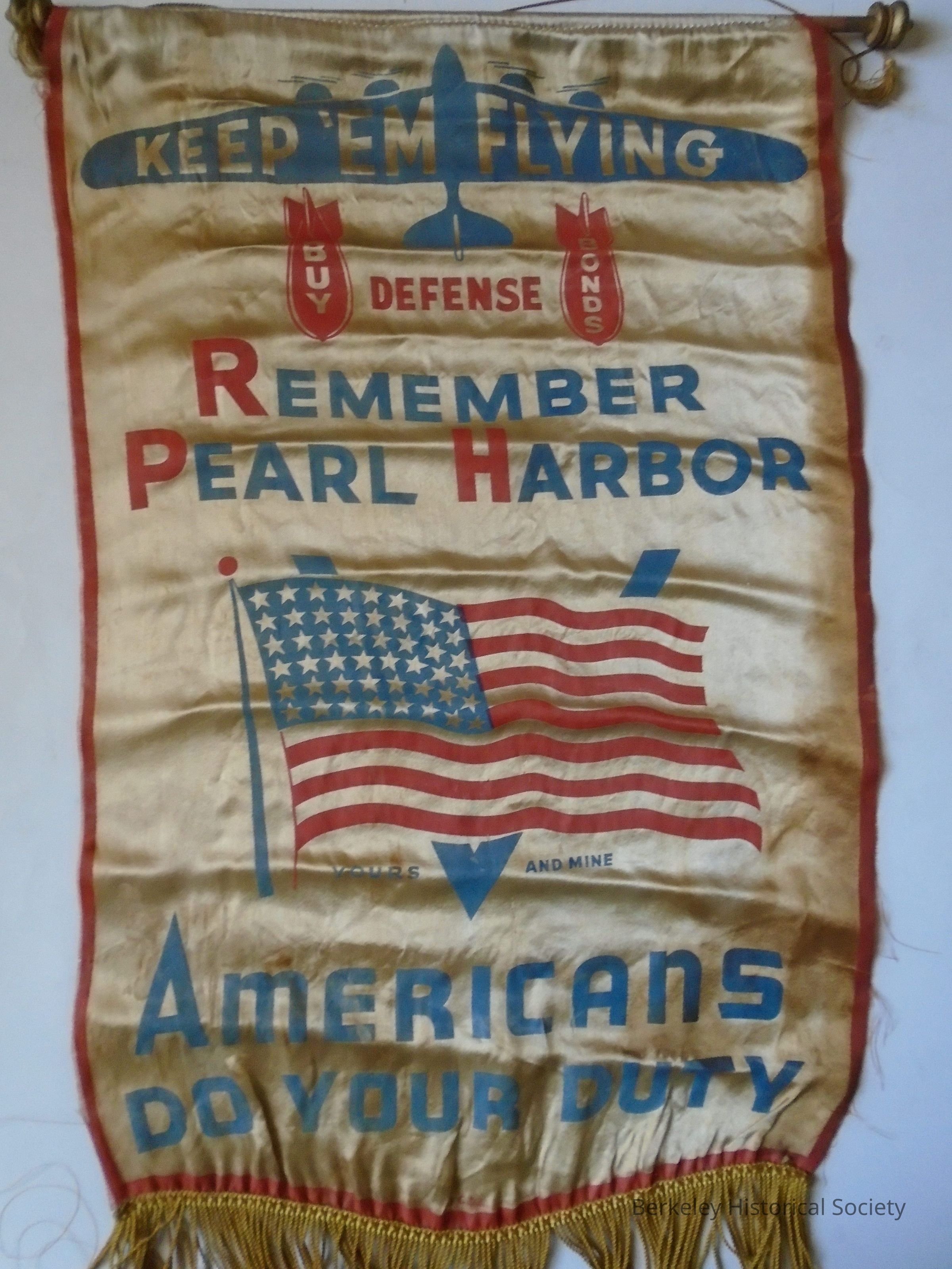 Silk Flag/Banner showing American flag (48 stars), plane & bombs, "Keep 'Em Flying, Buy Defense Bonds, Remember Pearl Harbor, Americans Do Your Part". Colors of red, white and blue with gold fringe at bottom and wood bar at top with string for hanging.Made/Created