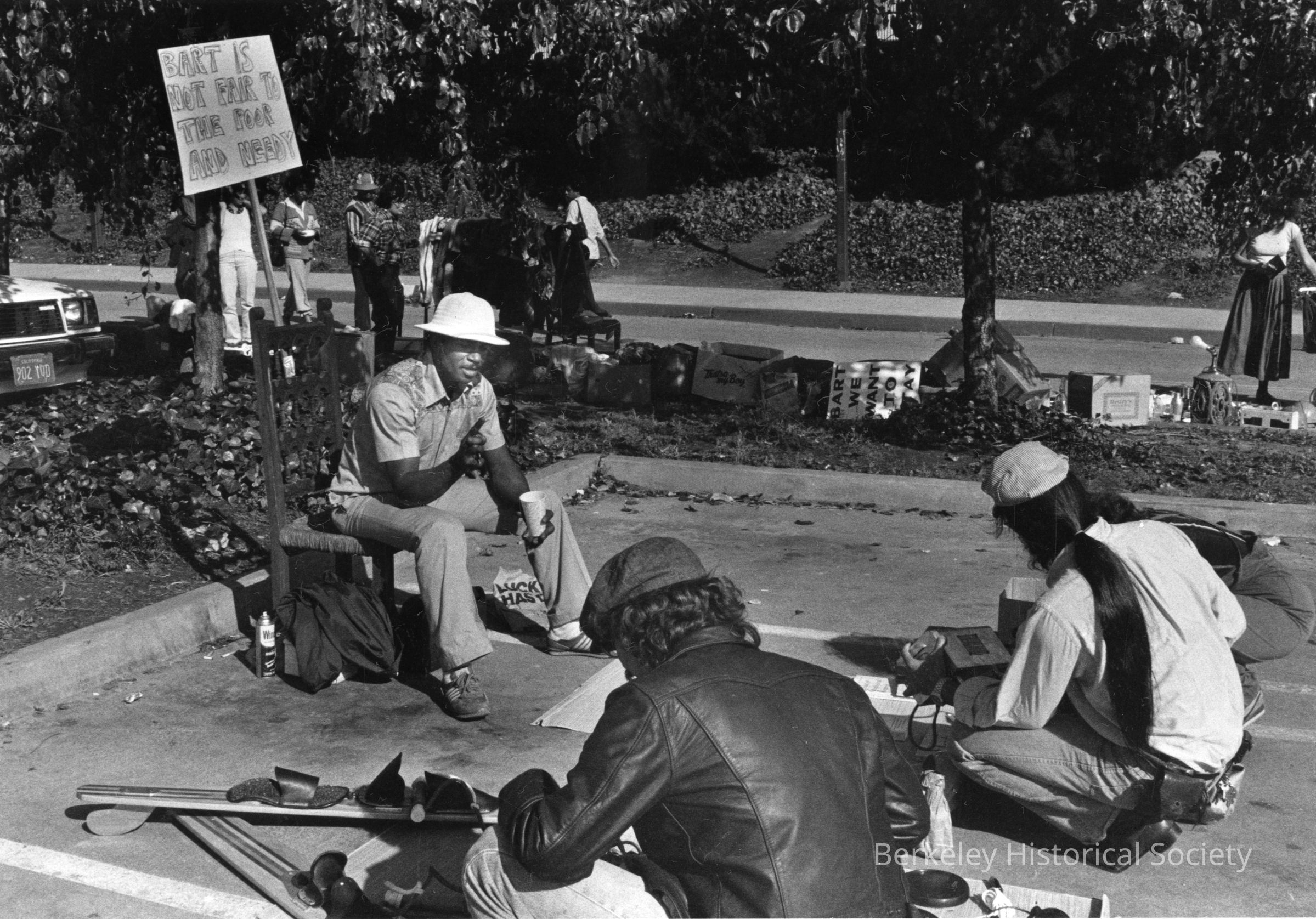 Man with sign protesting BART at Flea Market in Ashby BART parking lot.Other Names and Numbers