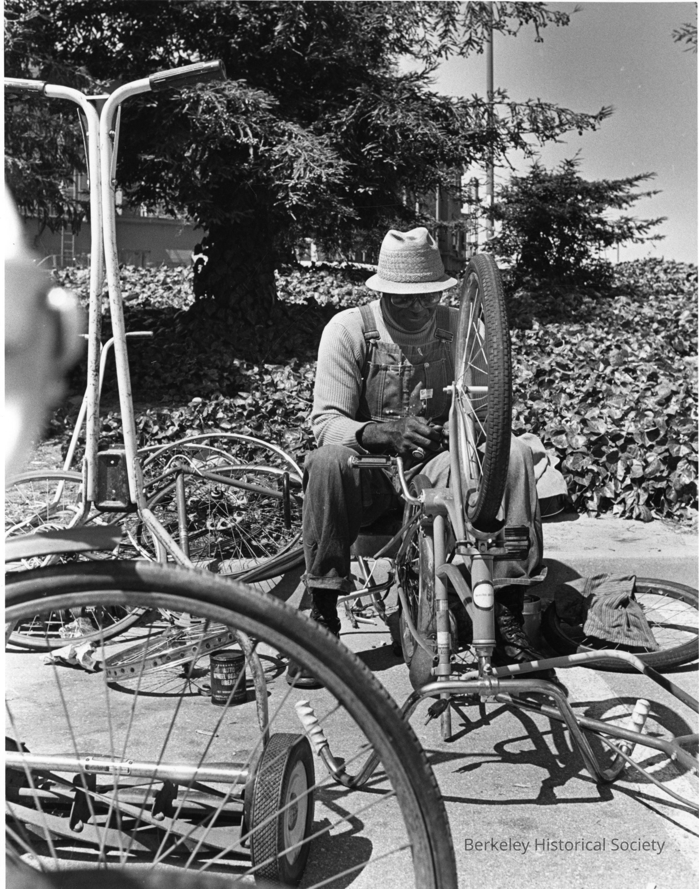 G. Godfrey repairing bicycles in Flea Market in Ashby BART parking lot.Other Names and Numbers