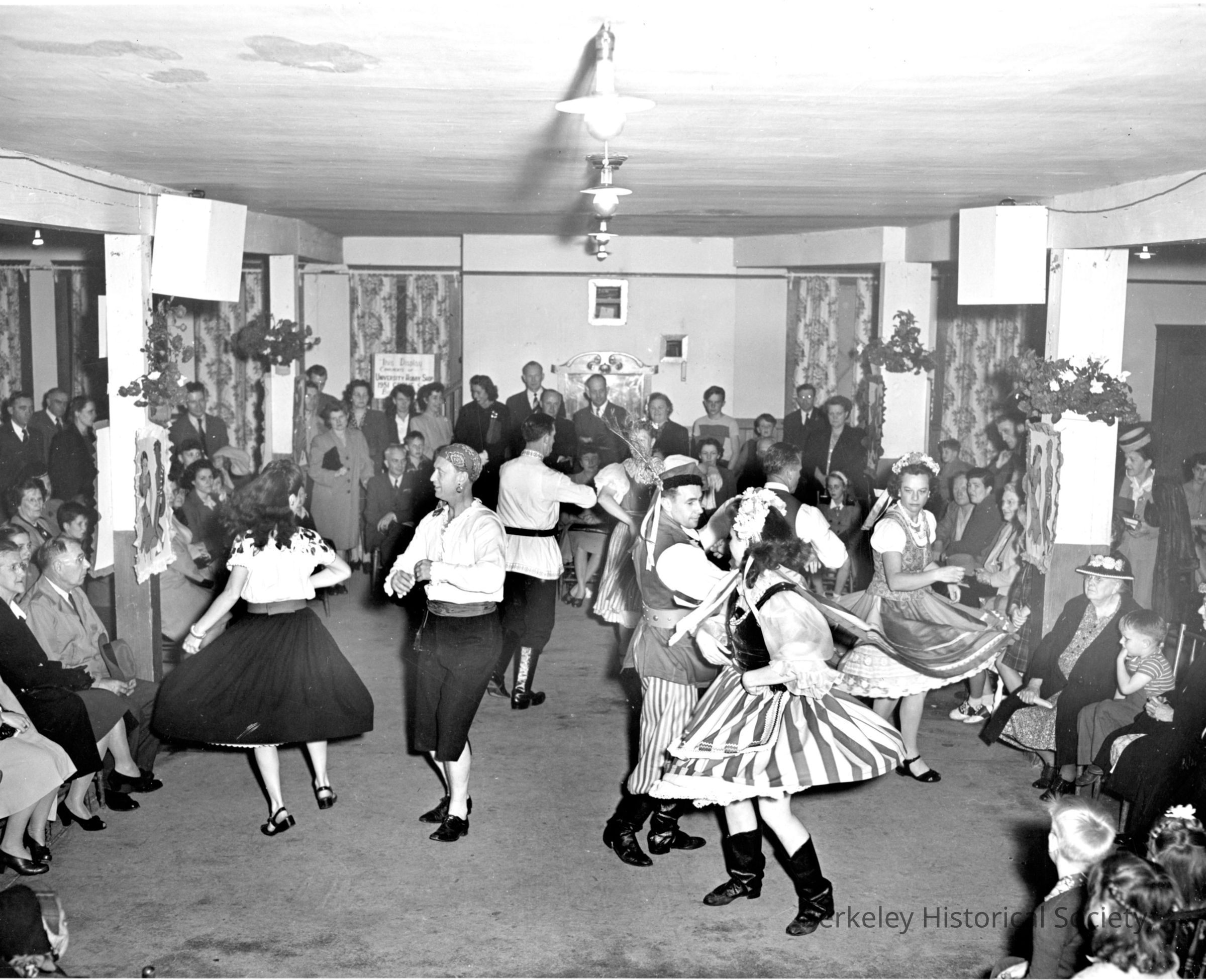 Folk dancers perform in a large room for an audience of all agesOther Names and Numbers