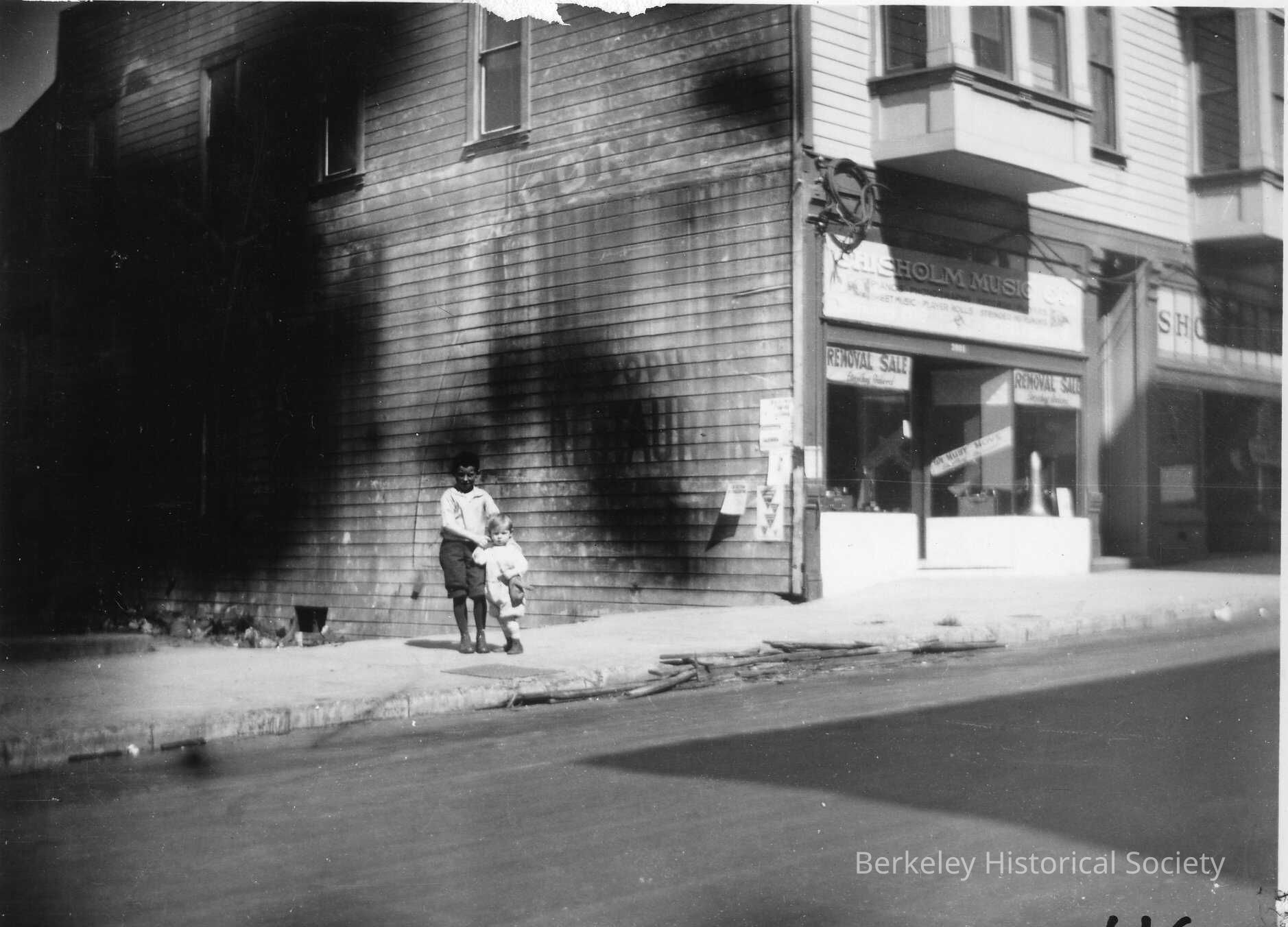 Two young boys standing on sidewalk in front of vacant lot. Faded Fonzo's Restaurant sign can be seen on the side of Chisholm Music Company.
