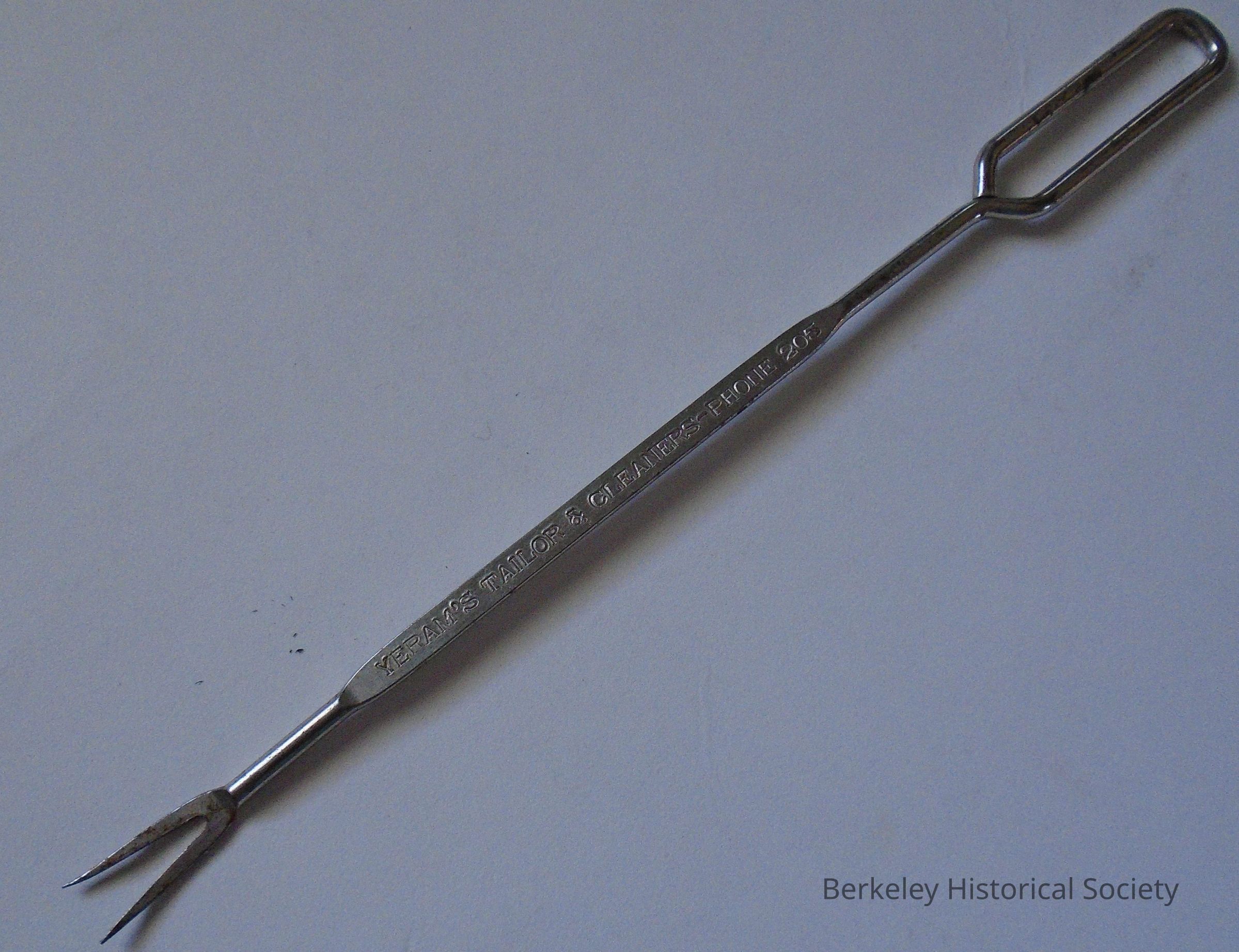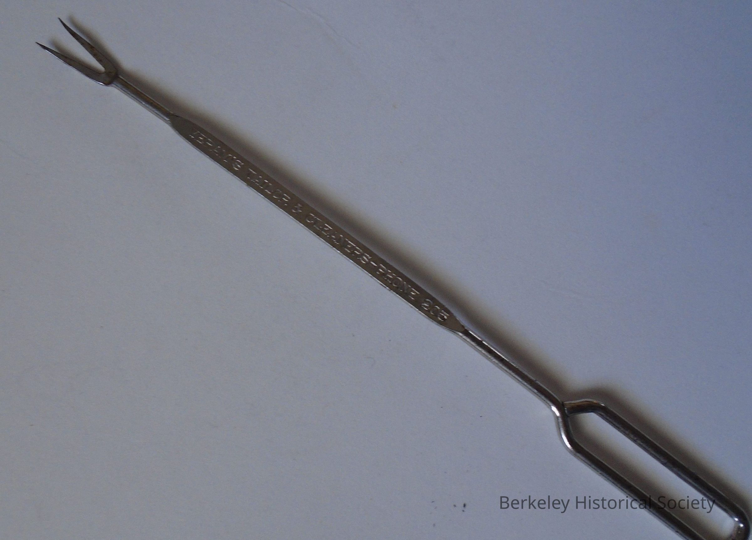 Silver colored metal fork, perhaps a cocktail or hors d'oeuvre fork. Embossed on handle: Yeram's Tailor & Cleaners - Phone 205.