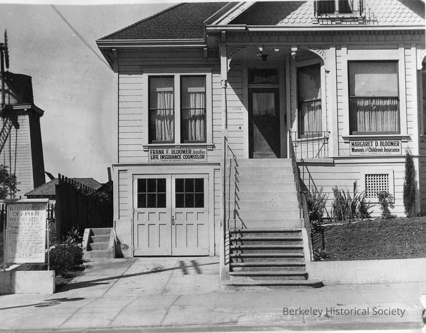 Residential house with sign for Bloomer; also Margaret D. Bloomer, women's and children's insurance. 1708 Shattuck Avenue.Made/Created