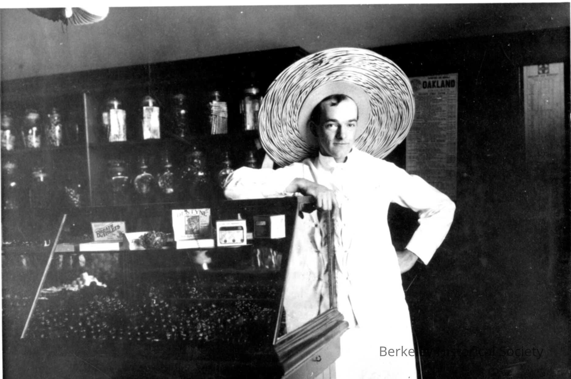 Frank (Abe) Lincoln standing in a candy shop, leaning on candy counter, wearing a hat made of spiraled candy. Vine Street near Shattuck?