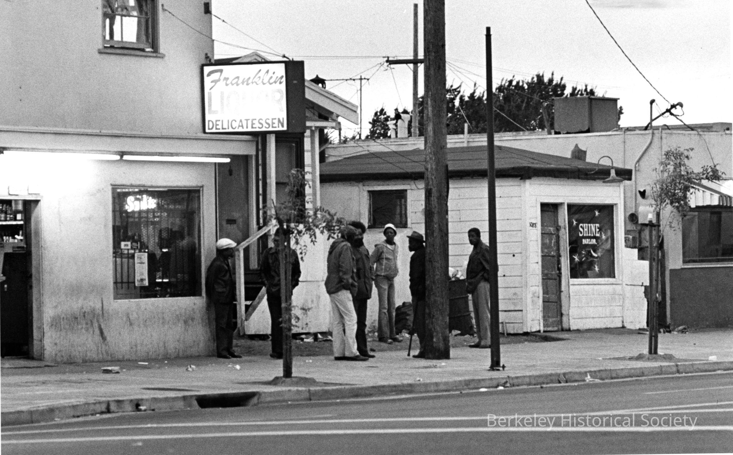 Businesses on Sacramento Street, south of Ashby. Shine Parlor next door. Group of men conversing on sidewalkOther Names and Numbers