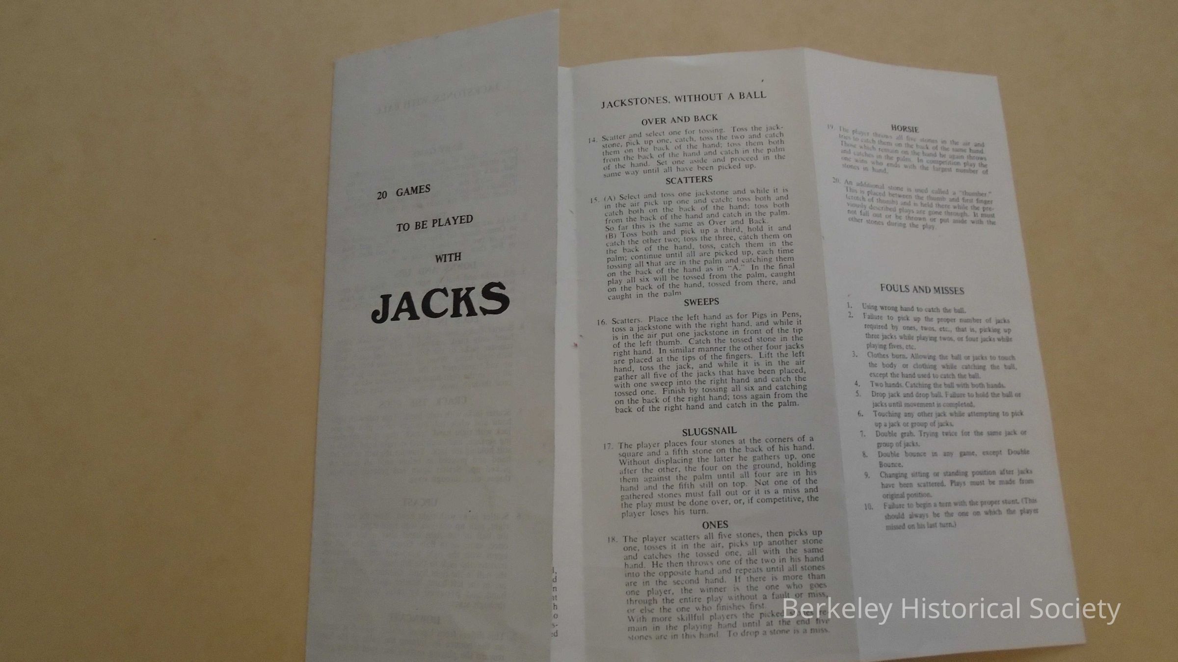 Paper instructions for the game of Jacks or Jackstones. (Played with a ball.) Lists 20 games to be played with Jacks.