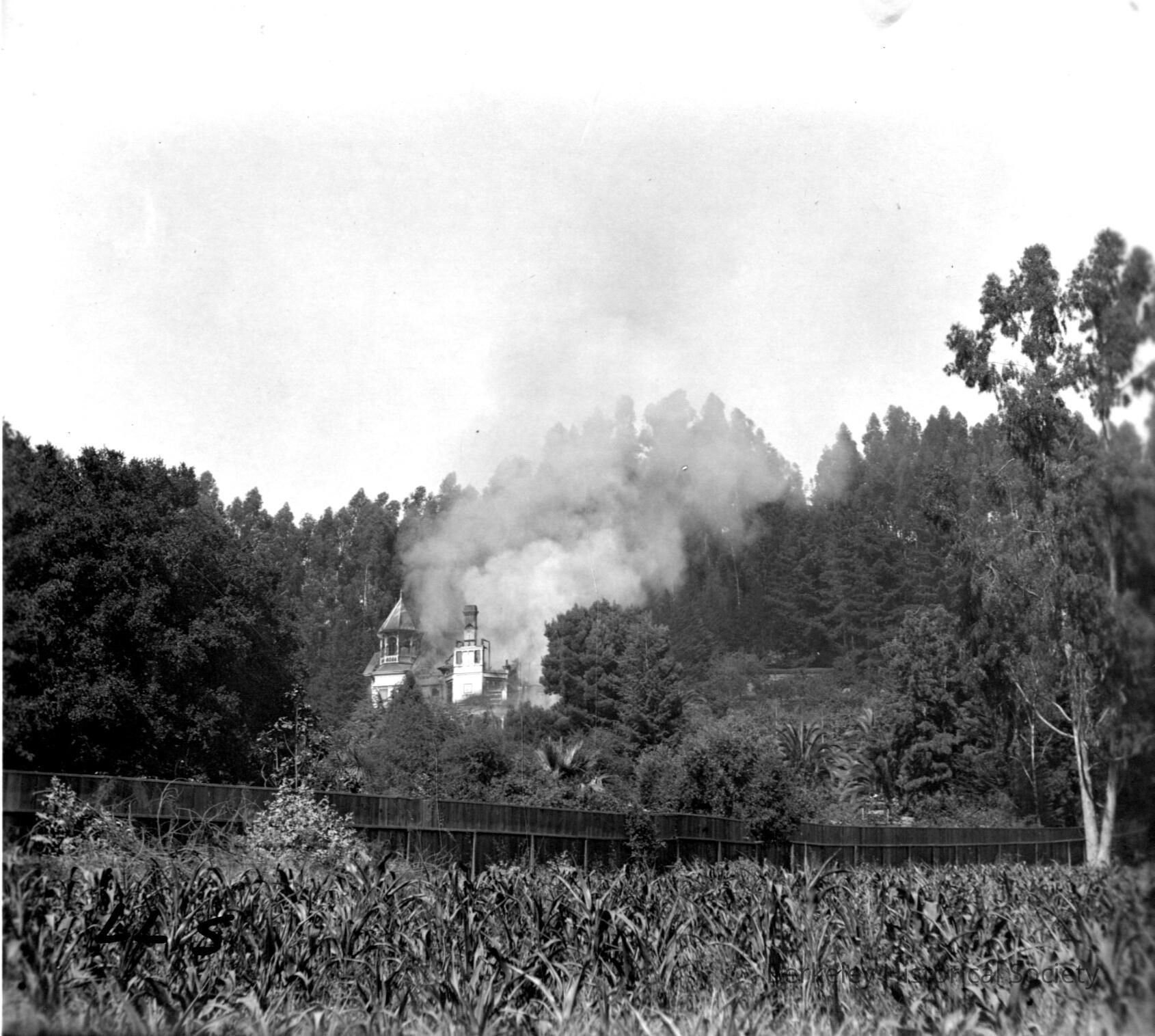View across open land to house on fire.Made/Created