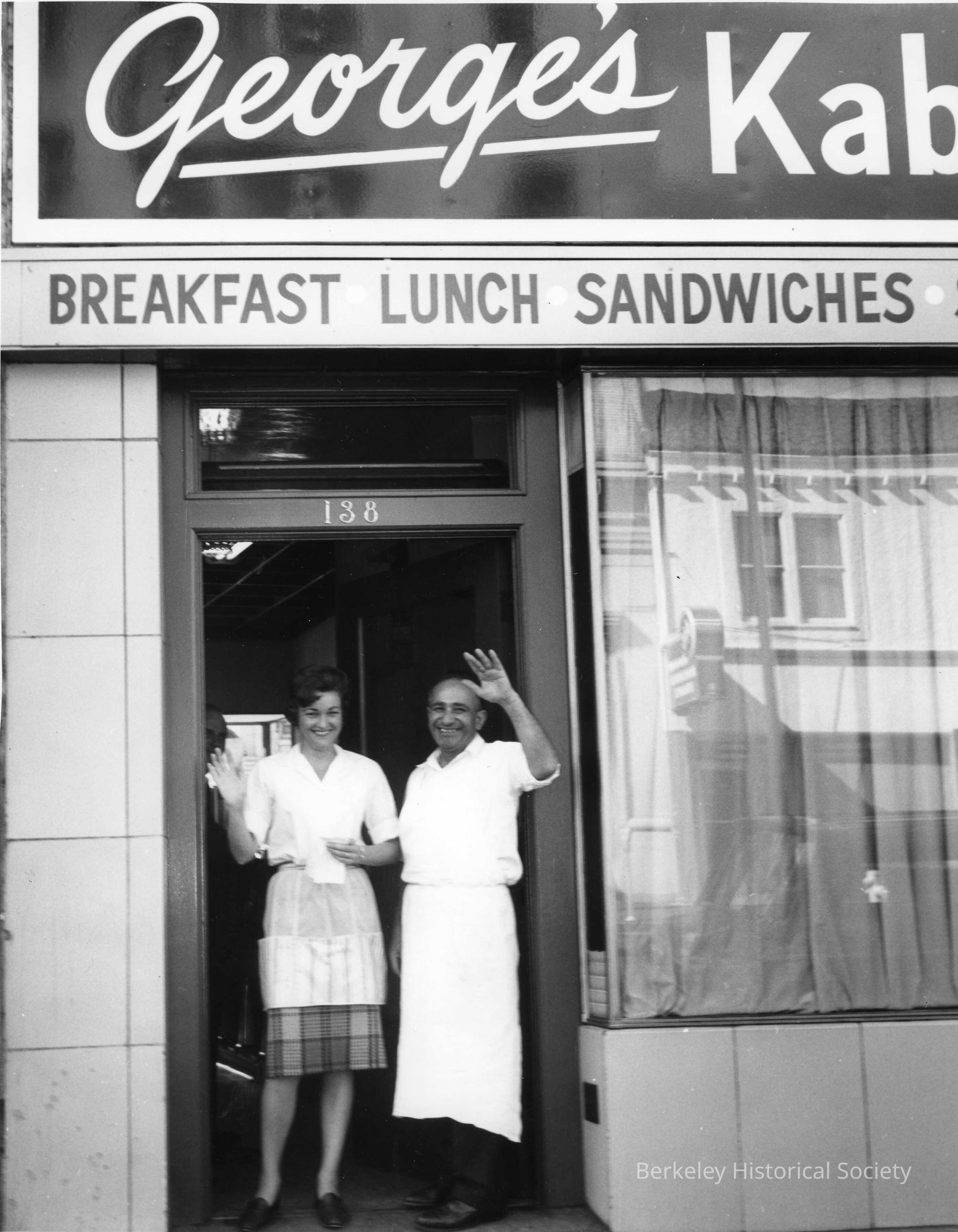 George (?) and waitress waving from doorway of George's Kabob
