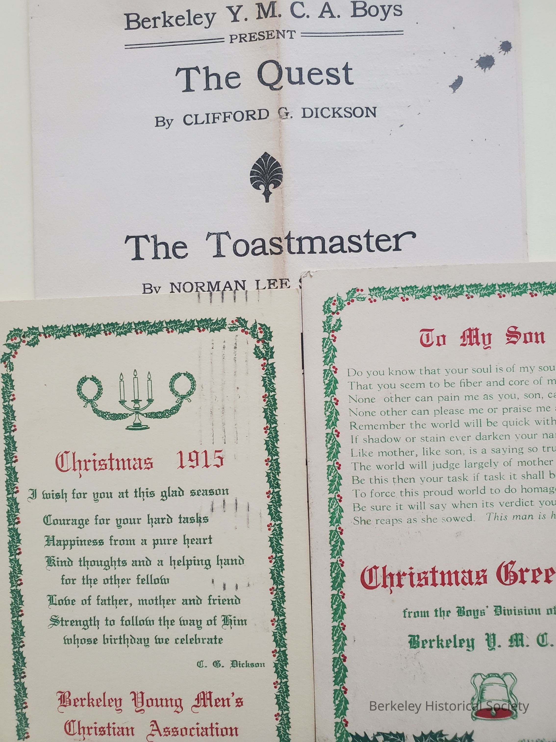 Two Christmas greeting postcards frm YMCA, to Ray Dustin, 1915 and 1916. Program for a play given by Berkeley YMCA Boys, 1916.