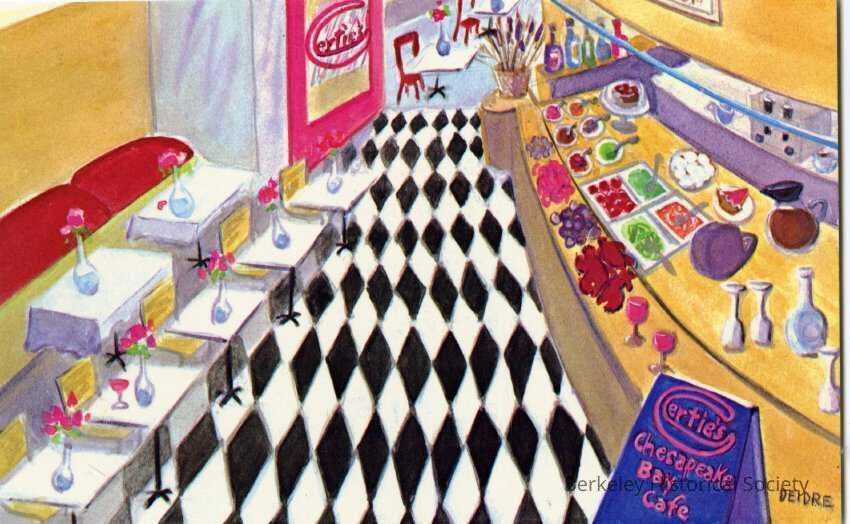 Postcard featuring color drawing of the interior of Gertie's Chesapeake Bay Cafe located at 1919 Addison. This reproduction of a drawing is signed "Deidre."