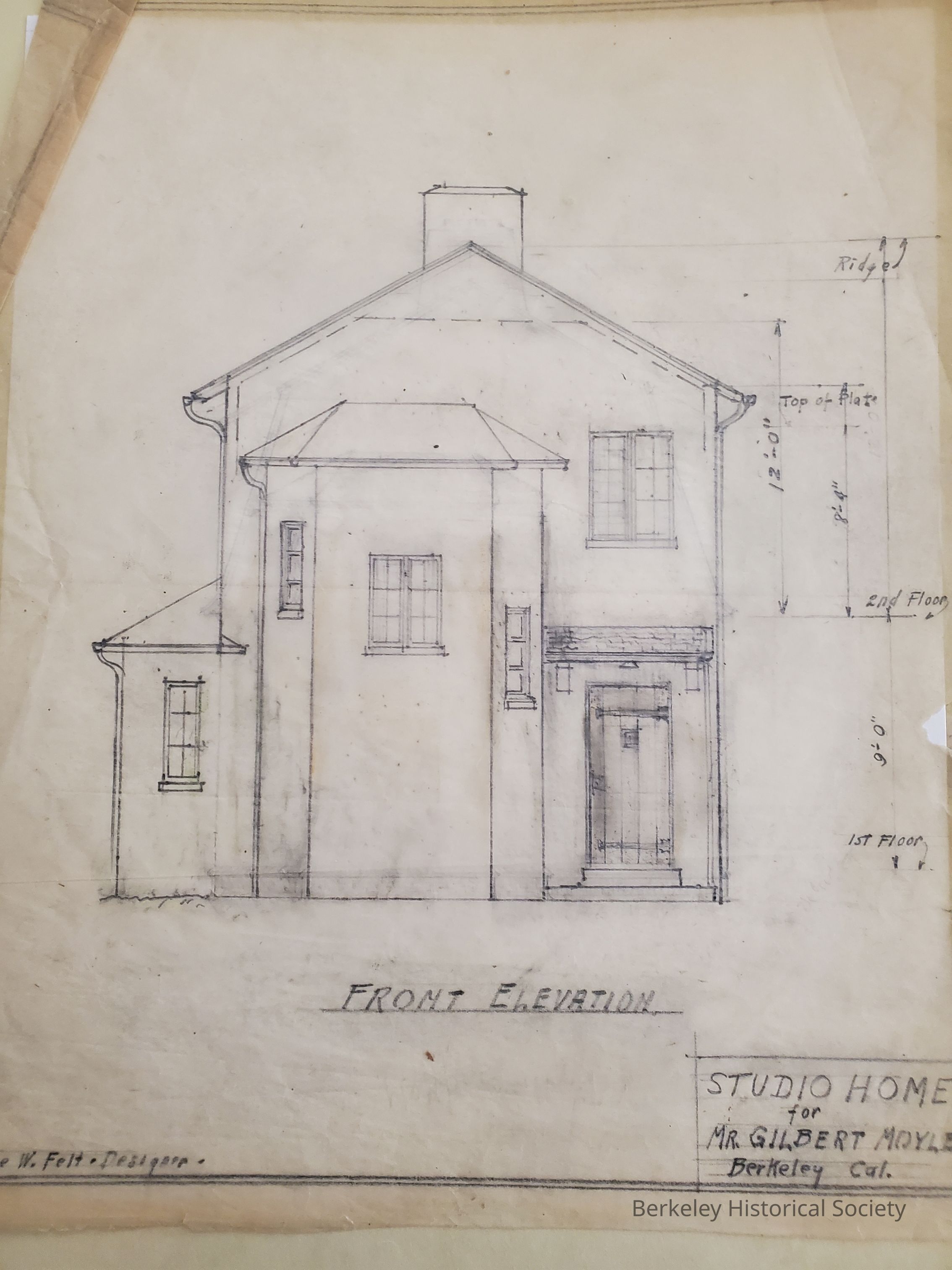 Drawings (3), architectural: Moyle Studio House; plans elevations, tracing paper, pencil on flimsy,Lee w. Felt, designer, at 1584 Hawthorne Terrace. Front elevation, first and second floor plans.