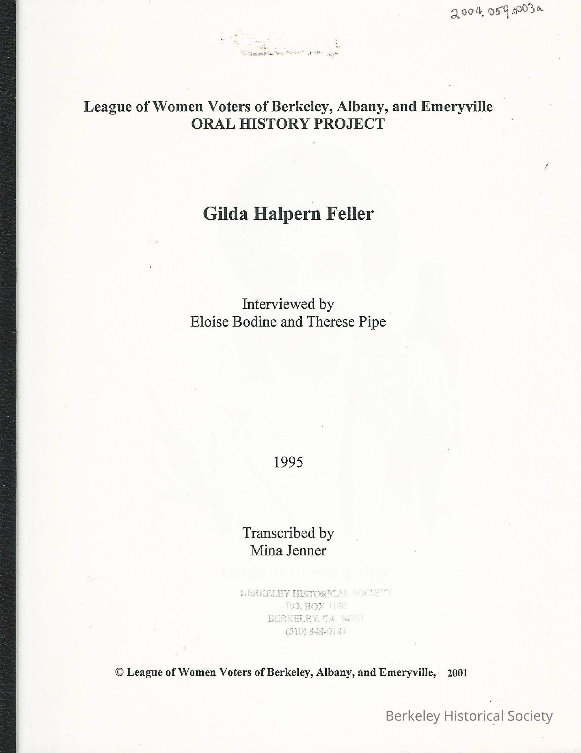 Forms part of League of Women Voters of the Bay Area Oral History Project transcripts, 1999-2004.